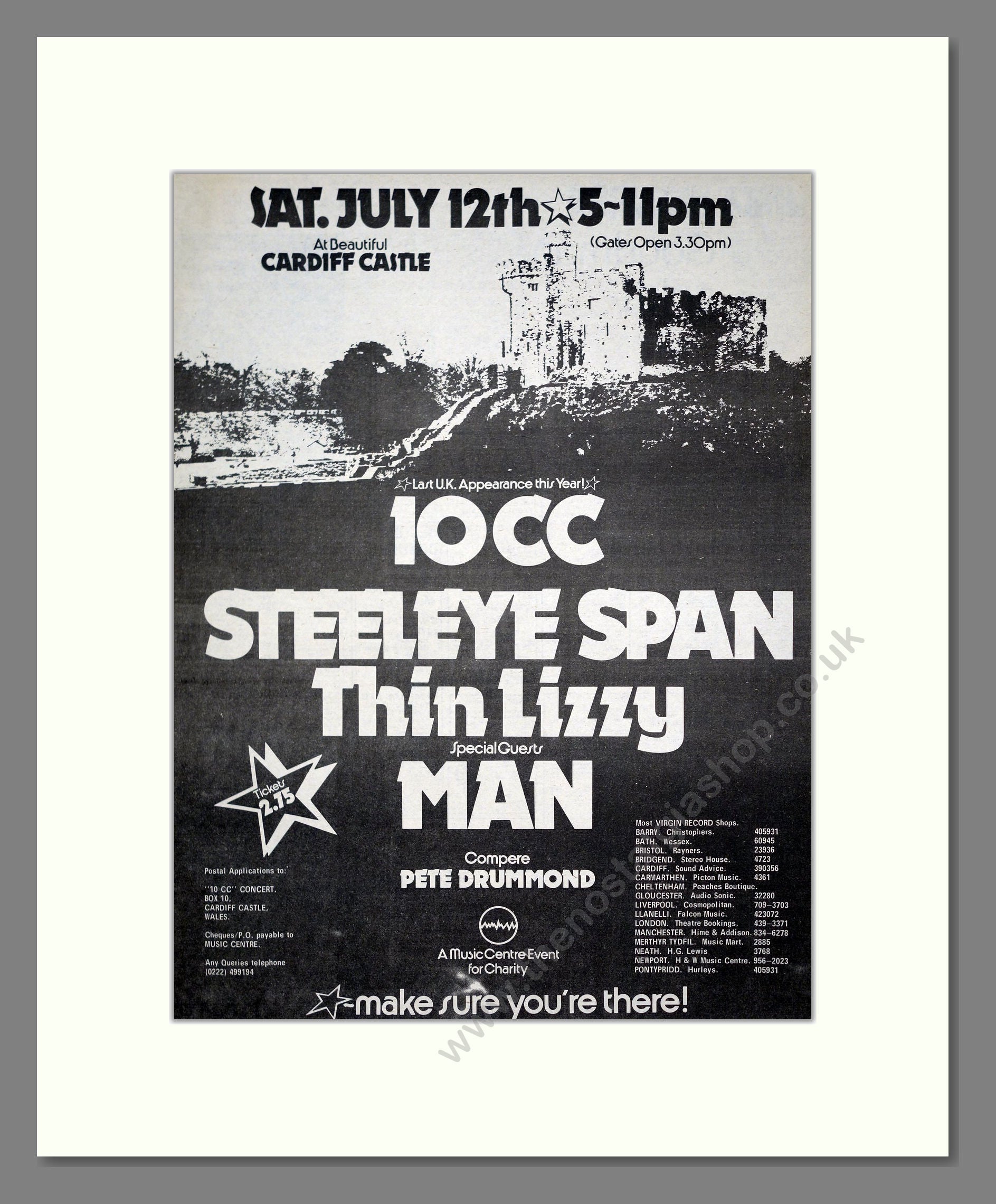 10CC / Steeleye Span / Thin Lizzy - Cardiff Castle. Vintage Advert. This is a large classic original advert from 1975. Presented and supplied in a cream bevel cut mount with backing card and clear bag. Ready to fit in a 20 x 16 inches frame. The mounted advert will be posted via courier and well packed - protected with a sheet of hardboard to keep it rigid. Any questions or enquiries, please get in touch, we are here to help! All our adverts, unless clearly stated are originals from the date shown. They make excellent pieces of wall art and stunning gifts. Many are rare and hard to find and once sold, may not be replaced. Remember you are buying a piece of history. Website watermark is not on original.
