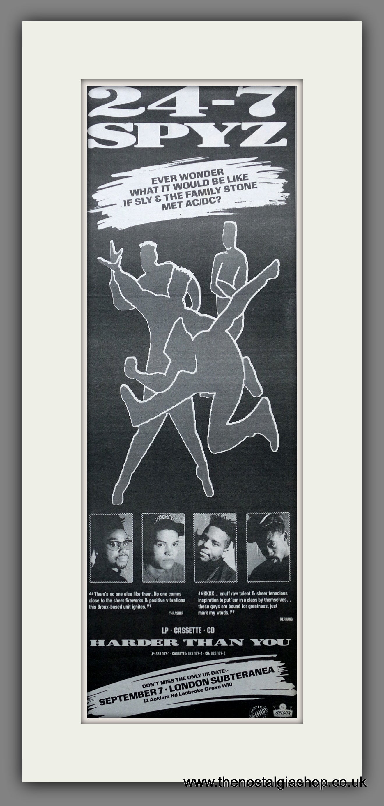 Twenty Four Seven Spyz Harder Than You. Vintage Advert. Original advert 1989. Presented and Supplied in cream bevel cut mount with backing card and display bag. Ready to fit in 20 x 10 inch frame. All our adverts, unless clearly stated are Originals from the date shown. They make excellent pieces of wall art and stunning gifts. Many are rare and hard to find and once sold, may not be replaced. Remember you are buying a piece of history. Website watermark is not on original.