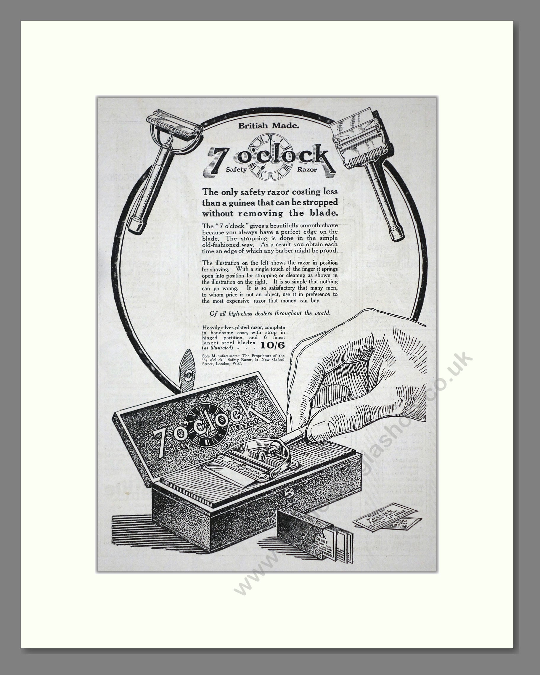 7 O'Clock - Safety Razor. Vintage Advert. This is a classic original advert from 1919. Presented and supplied in a cream bevel cut mount with backing card and clear bag. Ready to fit in a 14 x 11 inches frame. The mounted advert will be posted via courier and well packed - protected with a sheet of hardboard to keep it rigid. Any questions or enquiries, please get in touch, we are here to help! All our adverts, unless clearly stated are originals from the date shown. They make excellent pieces of wall art and stunning gifts. Many are rare and hard to find and once sold, may not be replaced. Remember you are buying a piece of history. Website watermark is not on original.