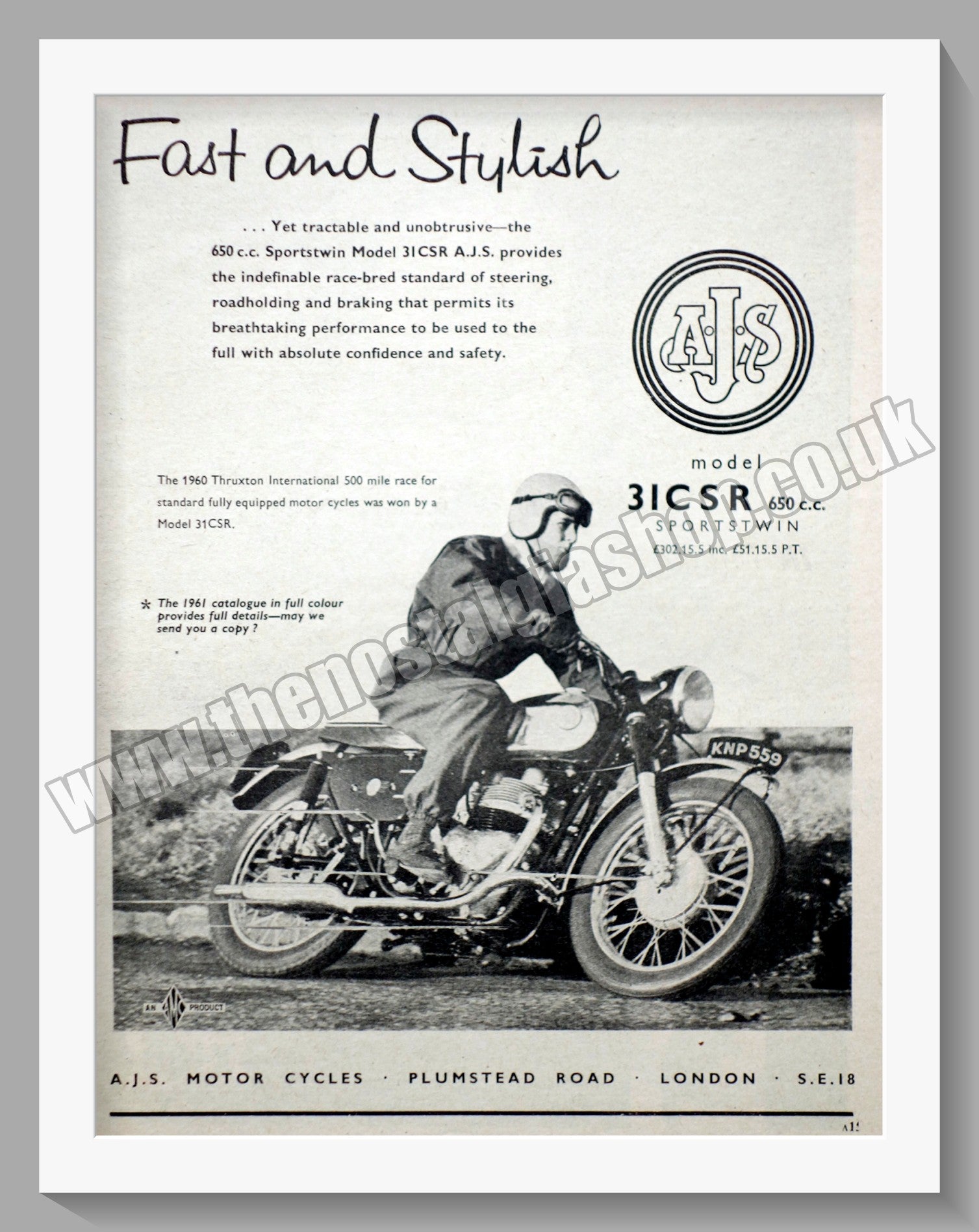 AJS 31 CSR 650cc Sports Twin Motorcycle. Original Vintage Advert from 1961. Presented and Supplied in a 14 x 11 Inch, cream bevel cut mount with backing board and clear bag. Ready to frame. The perfect gift. These adverts are all Originals from the dates stated. They are NOT modern reprints. Many are difficult to get hold of , some are very rare and once sold may not be replaced, Remember, you are buying a piece of historic nostalgia. Website Watermark is not on the product. A.J.S. Motorcycles Plumstead Road London.