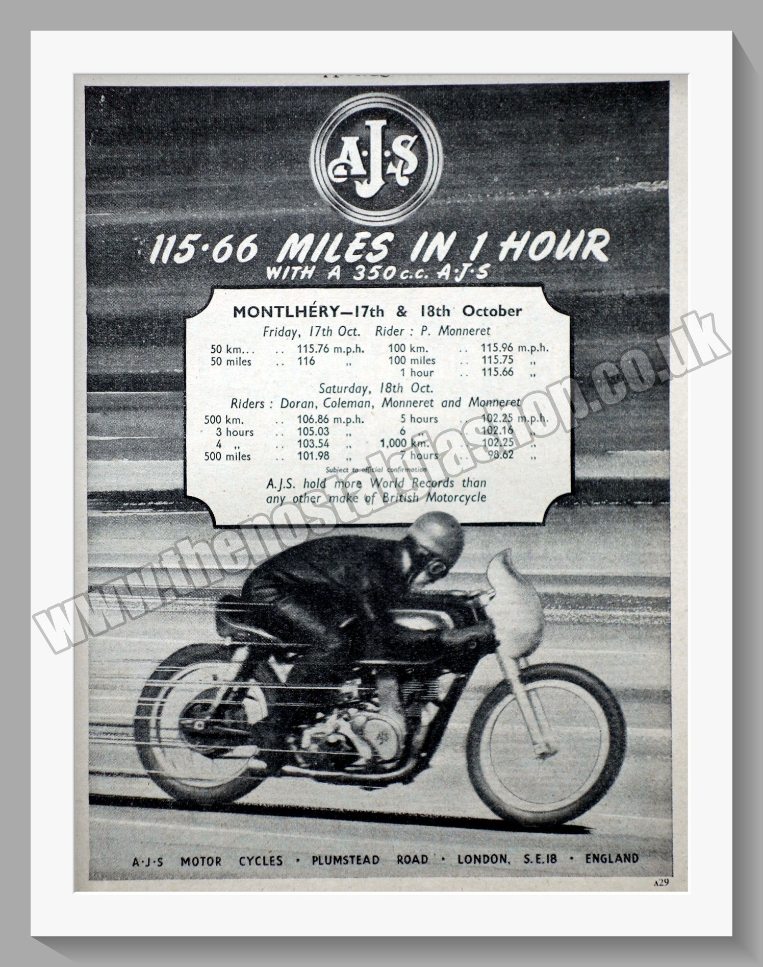 AJS 350cc Motorcycle hits 115mph at Montlhery. Original Vintage Advert from 1952. Presented and Supplied in a 14 x 11 Inch, cream bevel cut mount with backing board and clear bag. Ready to frame. The perfect gift. These adverts are all Originals from the dates stated. They are NOT modern reprints. Many are difficult to get hold of , some are very rare and once sold may not be replaced, Remember, you are buying a piece of historic nostalgia. Website Watermark is not on the product. A.J.S. Motorcycles Plumstead Road London.