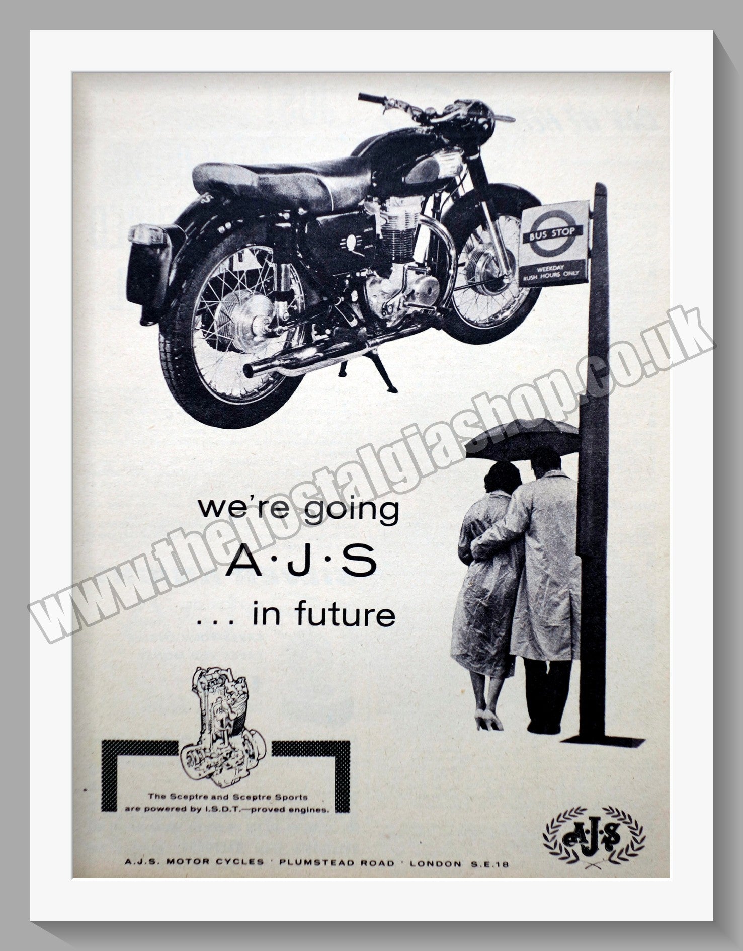 AJS Motor Cycles. Go AJS. Original Vintage Advert from 1962. Presented and Supplied in a 14 x 11 Inch, cream bevel cut mount with backing board and clear bag. Ready to frame. The perfect gift. These adverts are all Originals from the dates stated. They are NOT modern reprints. Many are difficult to get hold of , some are very rare and once sold may not be replaced, Remember, you are buying a piece of historic nostalgia. Website Watermark is not on the product. A.J.S. Motorcycles Plumstead Road London.