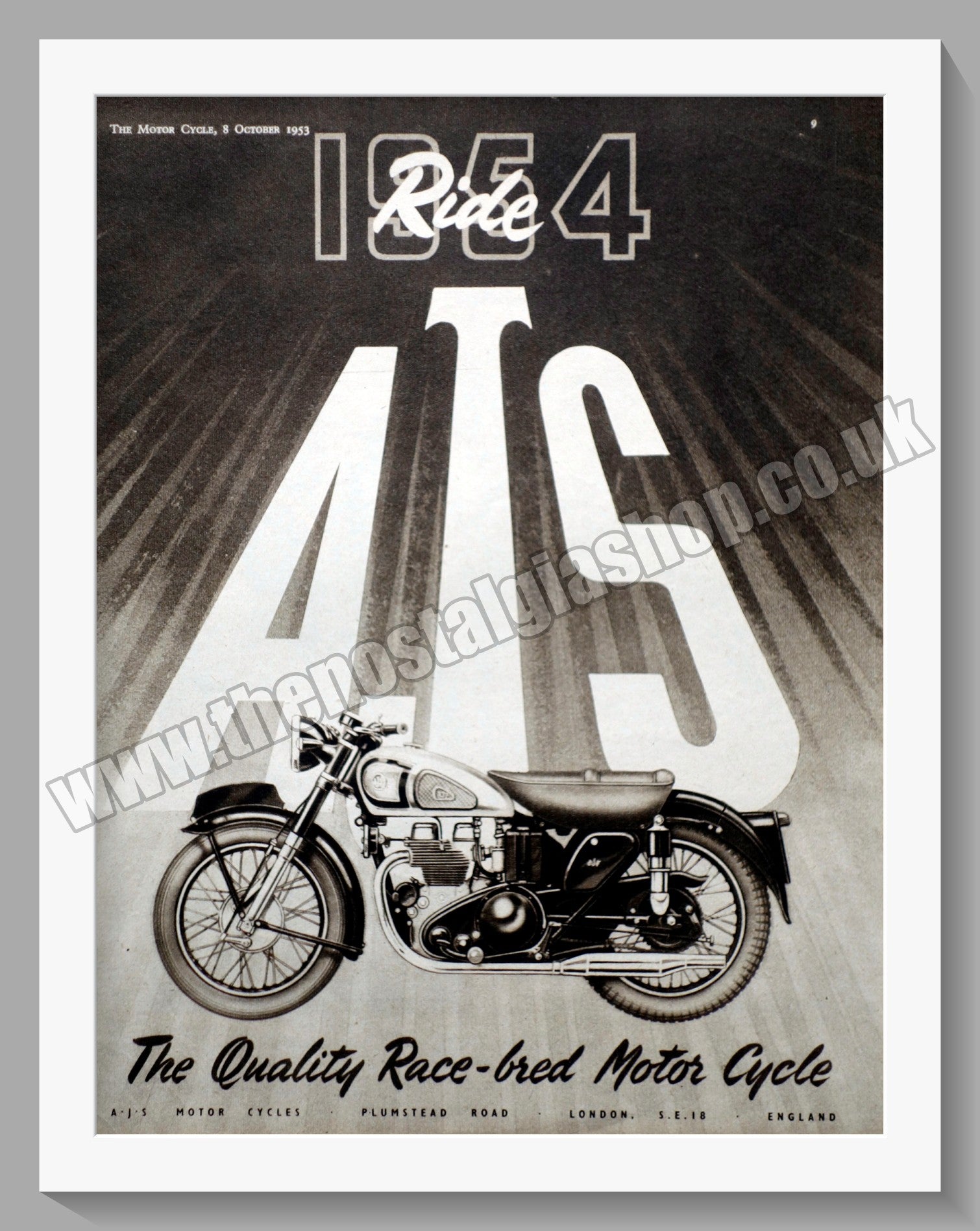 AJS Motor Cycles for '54. Original Vintage Advert from 1953. Presented and Supplied in a 14 x 11 Inch, cream bevel cut mount with backing board and clear bag. Ready to frame. The perfect gift. These adverts are all Originals from the dates stated. They are NOT modern reprints. Many are difficult to get hold of , some are very rare and once sold may not be replaced, Remember, you are buying a piece of historic nostalgia. Website Watermark is not on the product. A.J.S. Motorcycles Plumstead Road London.