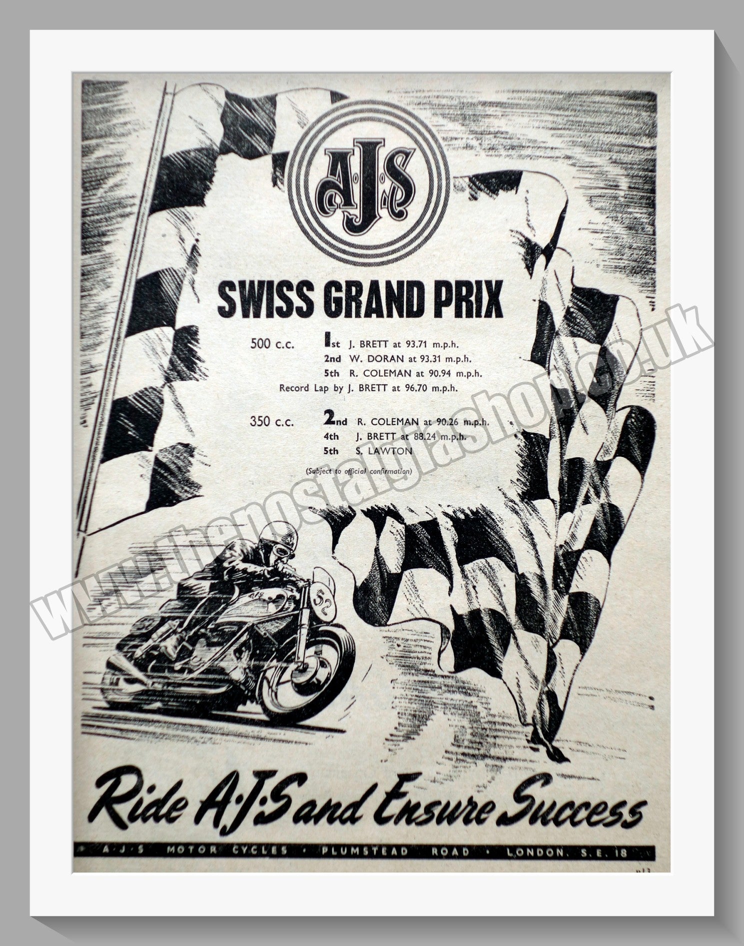 AJS Motorcycles Win Swiss Grand Prix. Original Vintage Advert from 1952. Presented and Supplied in a 14 x 11 Inch, cream bevel cut mount with backing board and clear bag. Ready to frame. The perfect gift. These adverts are all Originals from the dates stated. They are NOT modern reprints. Many are difficult to get hold of , some are very rare and once sold may not be replaced, Remember, you are buying a piece of historic nostalgia. Website Watermark is not on the product. A.J.S. Motorcycles Plumstead Road London.