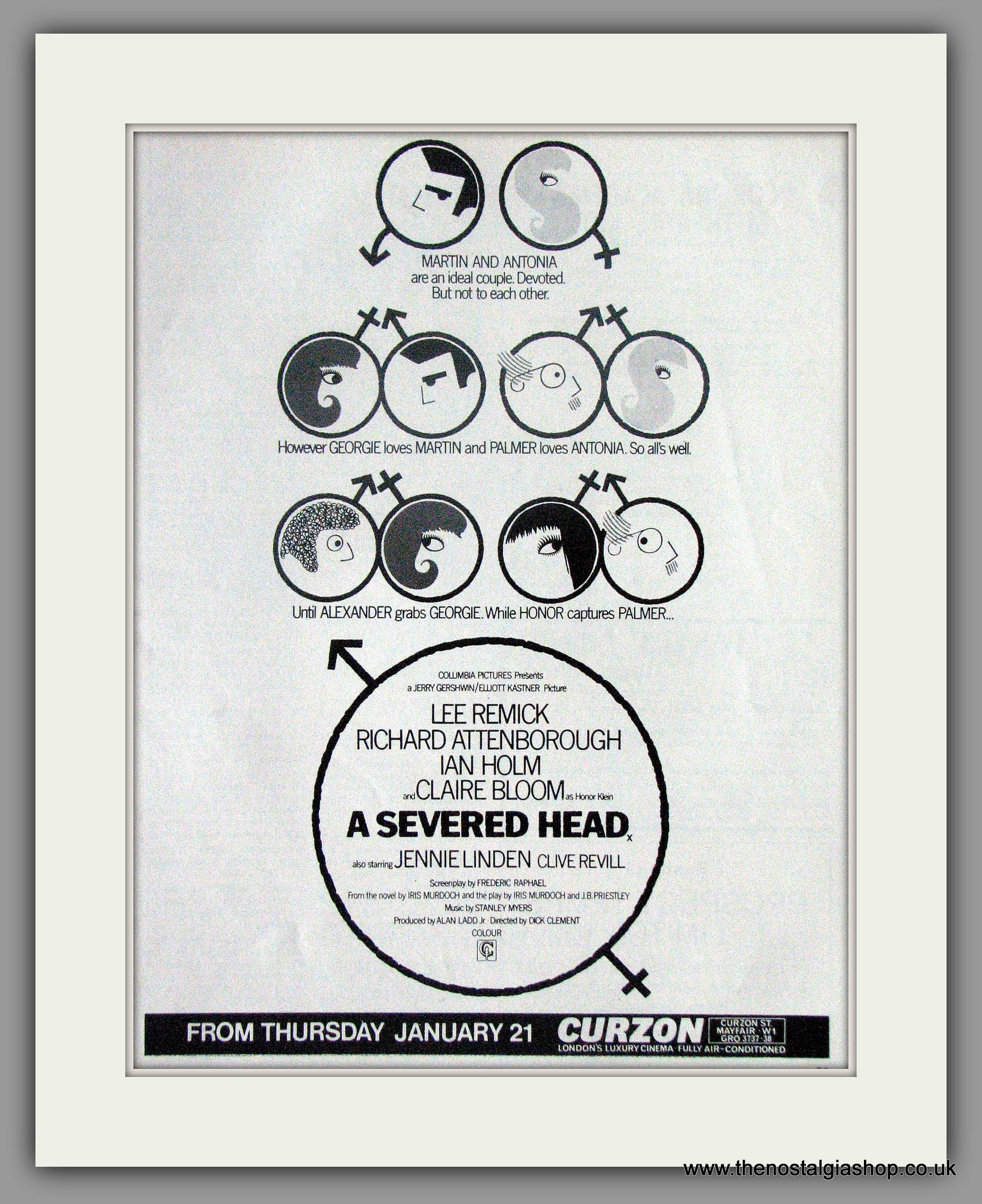A Severed Head. Lee Remmick, Richard Attenborough, Ian Holm. Original advert 1971. Presented in cream bevel cut mount with backing card. Ready to fit in 14 x 11 inch frame. Want it framing? buy this then go to Frames Available Category. Click to buy on the suitable frame and we will do the rest. All our adverts, unless clearly stated are Originals from the date shown. They make excellent pieces of wall art and stunning gifts. Many are rare and hard to find and once sold, may not be replaced. Remember you are buying a piece of history.