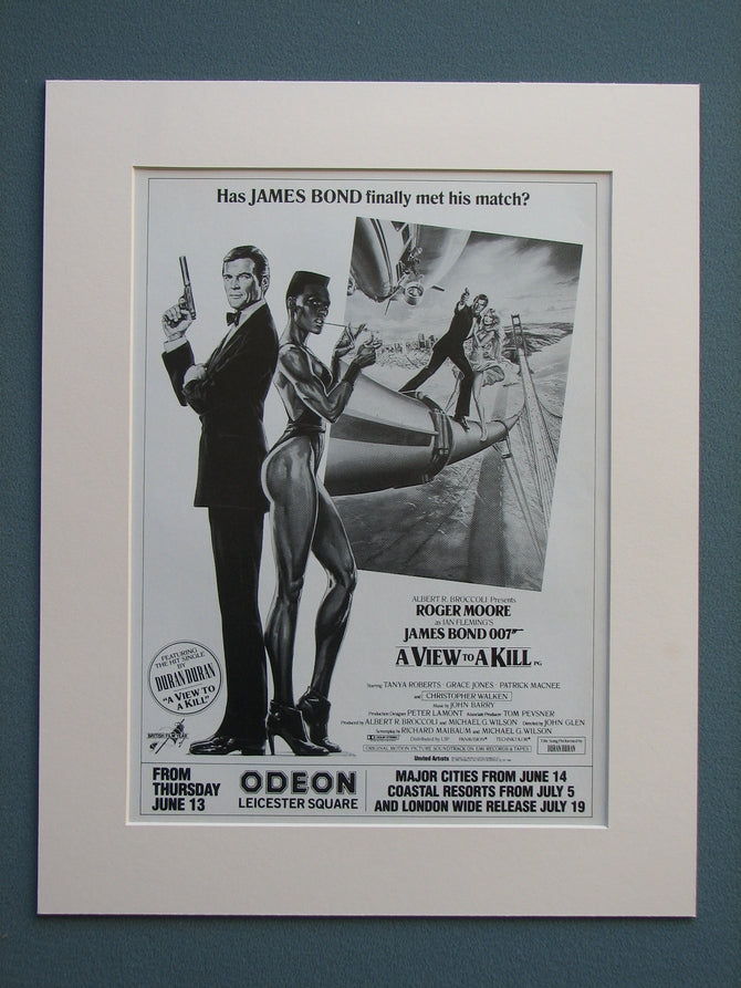 A View To A Kill - James Bond. 007 Roger Moore, Tanya Roberts, Grace Jones Christopher Walken. Original advert 1985. Presented and Supplied in a cream bevel cut mount with backing card. Ready to fit in 14 x 11 inch frame. Want it framing? If so, buy this then go to Frames Available Category. Click to buy on the suitable frame and we will do the rest. All our adverts, unless clearly stated are Originals from the date shown. They make excellent pieces of wall art and stunning gifts. Many are rare and hard to find and once sold, may not be replaced. Remember you are buying a piece of history.