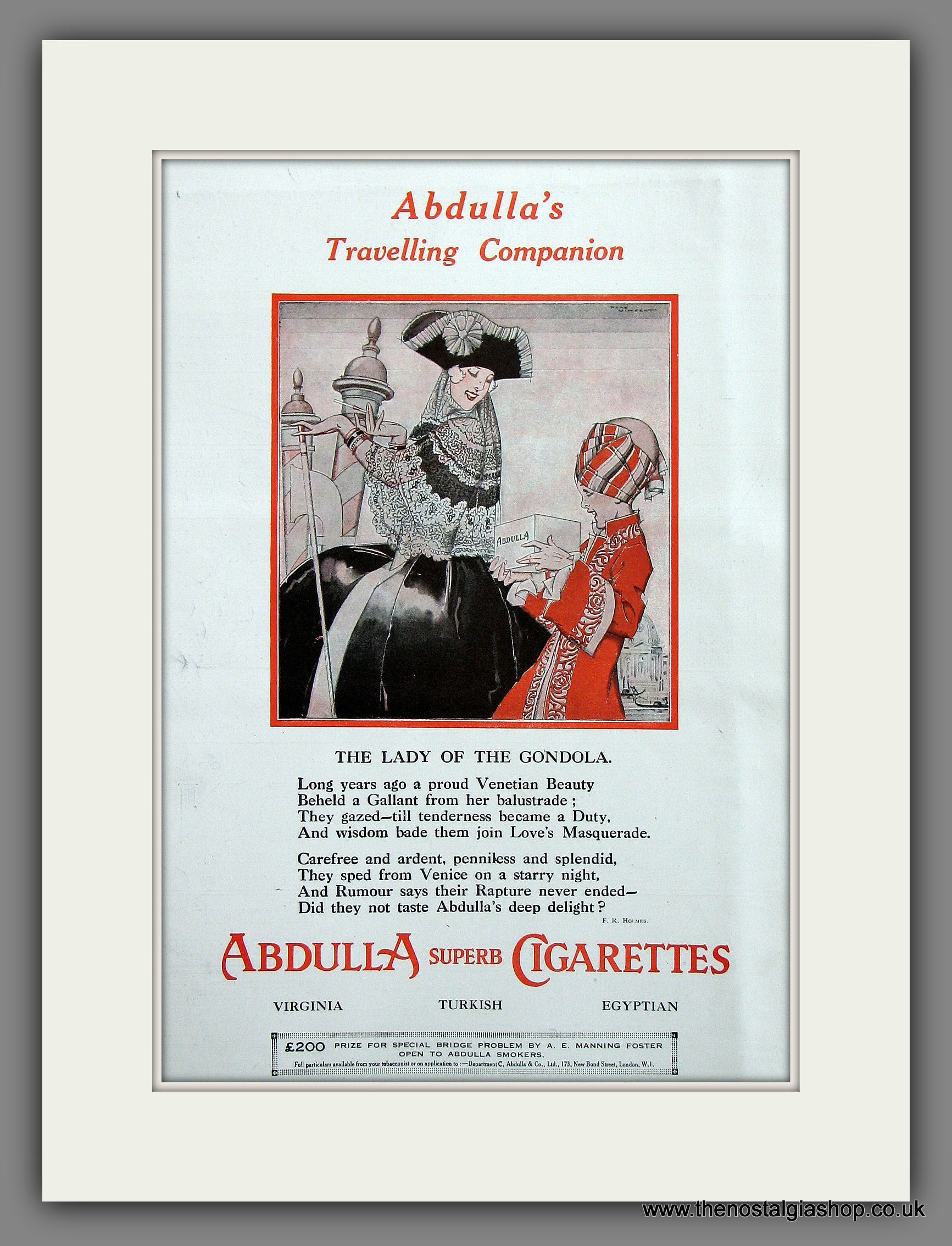 Abdulla Cigarettes. The Lady of The Gondola. Original Vintage Advert 1930. Presented and Supplied in a 18 x 14 Inch cream mount with backing board and clear bag. Ready for Framing. All our adverts, unless clearly stated are Originals from the date shown. They make excellent pieces of wall art and stunning gifts. Many are rare and hard to find and once sold, may not be replaced. Remember you are buying a piece of history. Website watermarks are not on original. Adverts will be well packed with hardboard to keep rigid in the post.