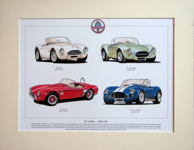AC Cobra 1962 - 1969 mounted print. Cars shown: 260(Mk I), AC 289 (MkIII), 427 (MkIII), 427 S/C (Mk III) Presented in bevel cut mount with backing board, and clear re-seal bag. Size of the mount is 18 by 14 inches, it is ready to drop straight in to a frame. Items will be well packed for protection. Postage discounts for multiple mount or frame purchases apply.