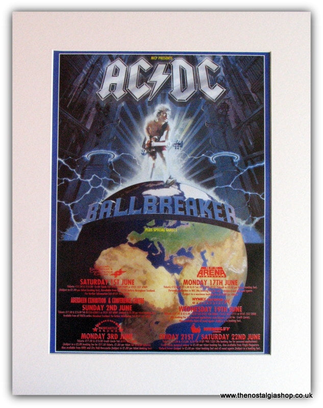 ACDC. AC-DC Tour Advert 1995. Ballbreaker Tour. Classic original advert 1995. Presented in cream bevel cut mount with backing card. Ready to fit in 14 x 11 inch frame. Want it framing? buy this then go to Frames Available Category. Click to buy on the suitable frame and we will do the rest. All our adverts, unless clearly stated are Originals from the date shown They make excellent pieces of wall art and stunning gifts. Many are rare and hard to find and once sold, may not be replaced. Remember you are buying a piece of history. Website watermark is not on original