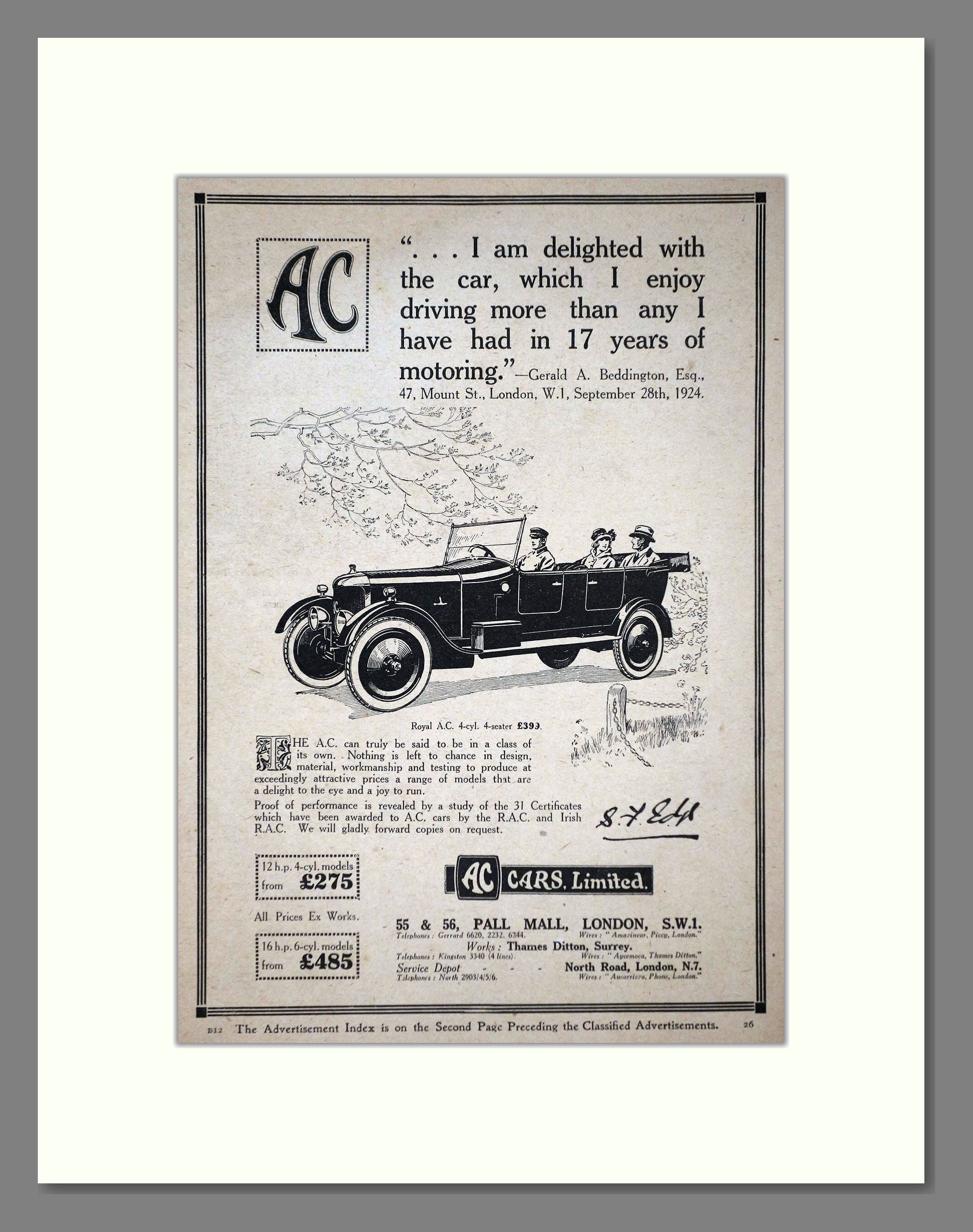 AC - Royal. Vintage Advert. This is a classic original advert from 1925. Presented and supplied in a cream bevel cut mount with backing card and clear bag. Ready to fit in a 14 x 11 inches frame. The mounted advert will be posted via courier and well packed - protected with a sheet of hardboard to keep it rigid. Any questions or enquiries, please get in touch, we are here to help! All our adverts, unless clearly stated are originals from the date shown. They make excellent pieces of wall art and stunning gifts. Many are rare and hard to find and once sold, may not be replaced. Remember you are buying a piece of history. Website watermark is not on original.