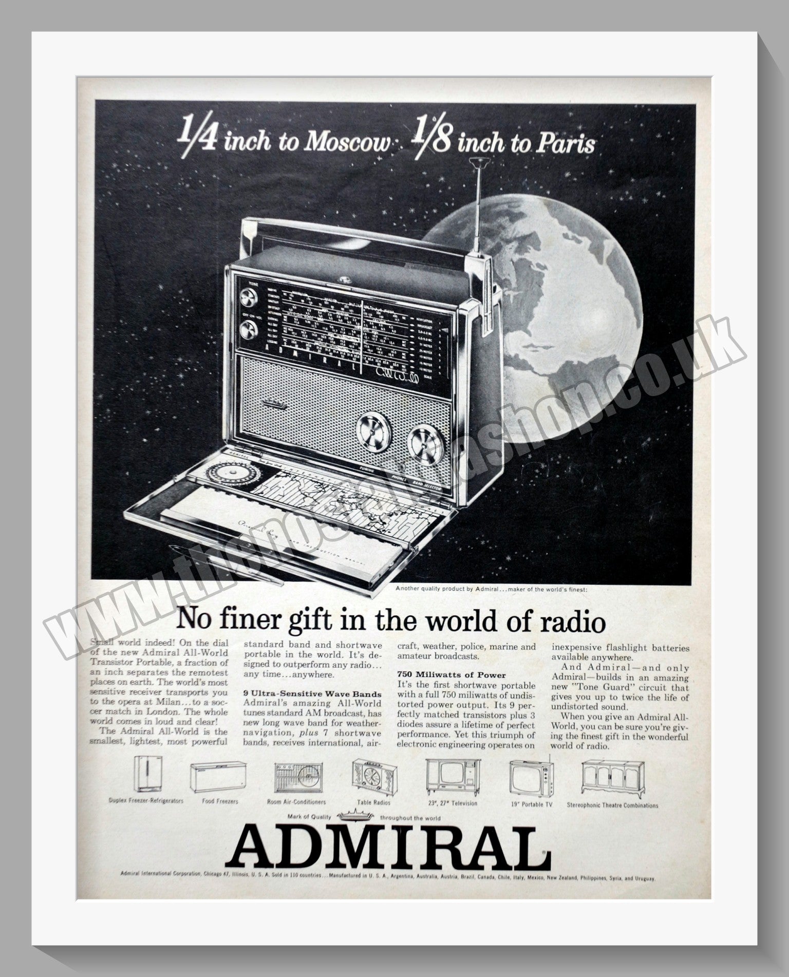 Admiral Portable Transistor. Vintage Advert. This is a large classic Original advert 1962. Presented and Supplied in a cream bevel cut mount with backing card and clear bag. Ready to fit in 18 x 14 inch frame. The mounted advert will be posted via courier and well packed - protected with a sheet of hardboard to keep it rigid. Any questions or inquiries, please get in touch, we are here to help! All our adverts, unless clearly stated are Originals from the date shown. They make excellent pieces of wall art and stunning gifts. Many are rare and hard to find and once sold, may not be replaced. Remember you are buying a piece of history. Website watermark is not on original .