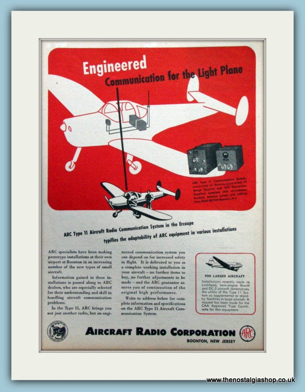 ARC Type II Aircraft Radio System. Engineered communication for the light plane. Classic original advert 1947. Presented in cream bevel cut mount with backing card and clear bag. Ready to fit in 14 x 11 inch frame. Want it framing? If so, buy this then go to Frames Available Category. Click to buy on the suitable frame and we will do the rest. All our adverts, unless clearly stated are Originals from the date shown. They make excellent pieces of wall art and stunning gifts. Many are rare and hard to find and once sold, may not be replaced. Remember you are buying a piece of history. Website watermark is not on original.