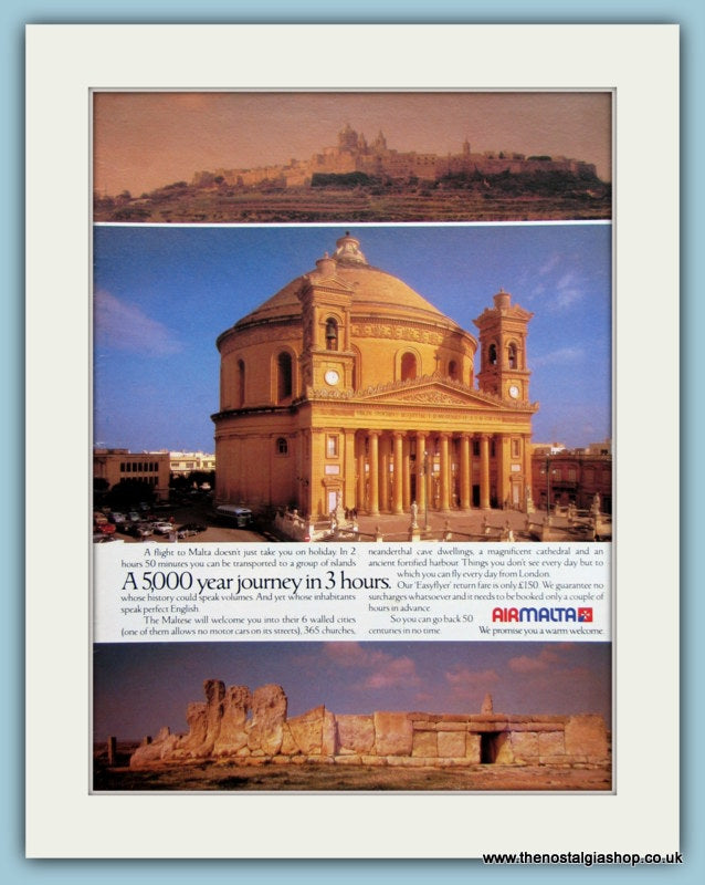 Airmalta. A 5,000 year journey in 3 hours. Classic original advert 1983. Professionally sealed and presented in cream bevel cut mount with backing card. Ready to fit in 14 x 11 inch frame. Want it framing? If so, buy this then go to Frames Available Catagory. Click to buy on the suitable frame and we will do the rest. All our adverts, unless clearly stated are Originals from the date shown. They make excellent pieces of wall art and stunning gifts. Many are rare and hard to find and once sold, may not be replaced. Remember you are buying a piece of history. Website watermark is not on original.