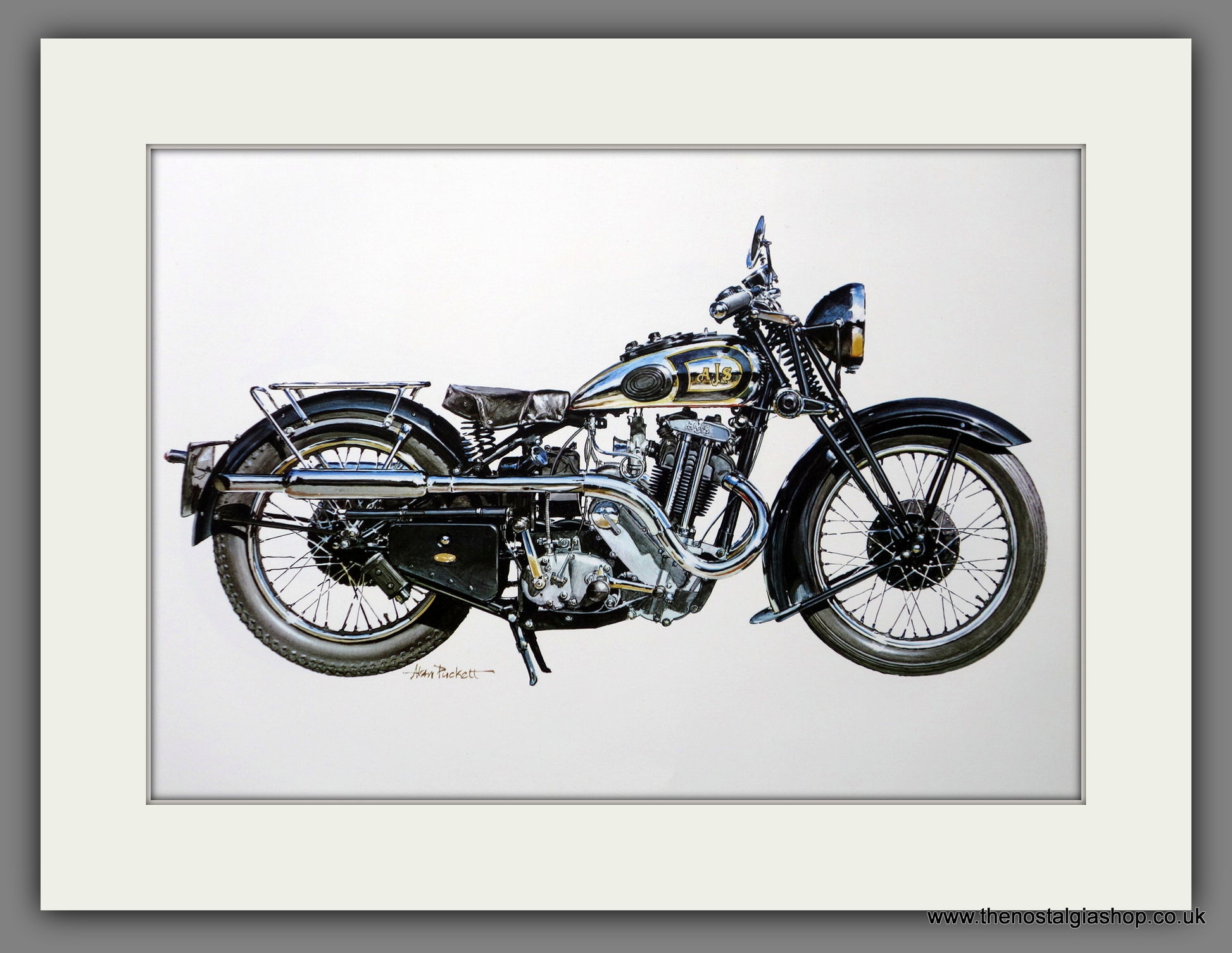 AJS Model 35/8. 1935 Motor Cycle. Classic Print from 1970's. Presented and Supplied in a cream bevel cut mount with backing board and Clear Bag. Made to fit straight into 14x11 inch frame. Motorcycle Prints.