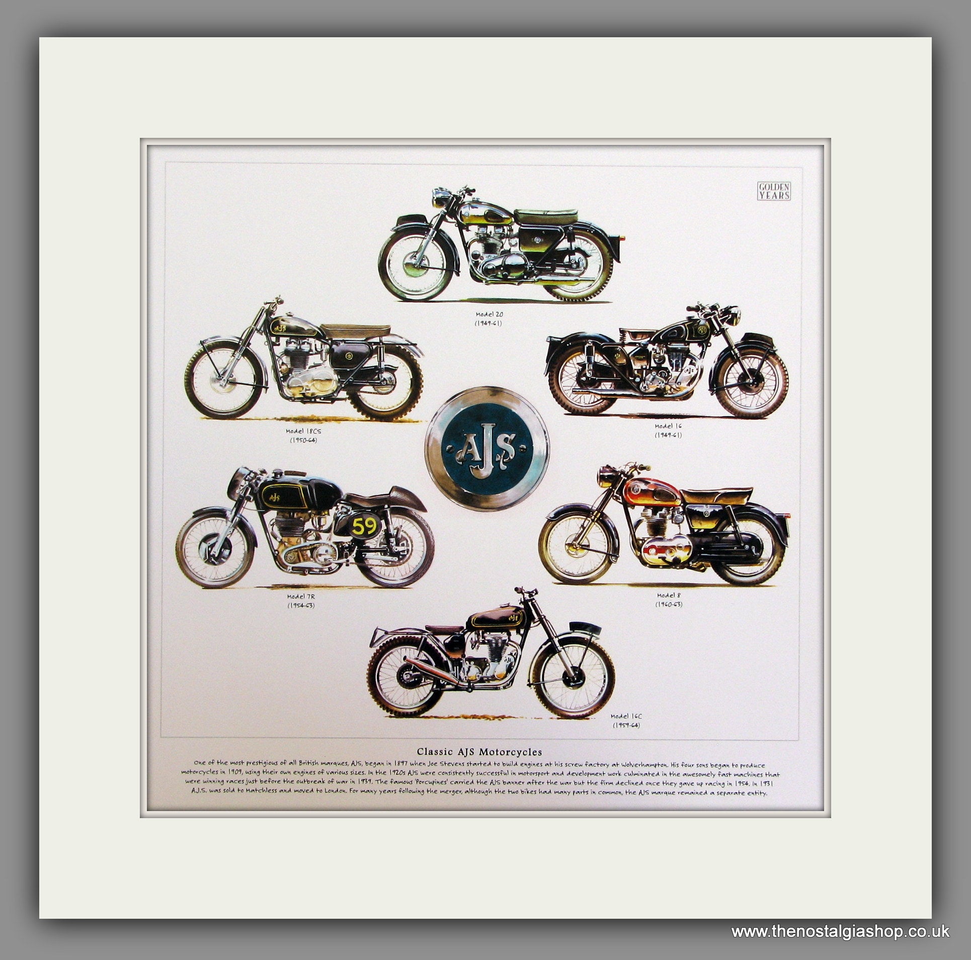 Classic AJS Motorcycles. Models shown; Model 20, Model 18CS, Model 7R, Model 16C, Model 8, Model 16. Presented in cream bevel cut mount with backing board and clear bag. The perfect gift. Size of the mount is 14.5 by 14.5 inches square, it is ready to drop straight in to a frame. Beautifully illustrated prints. Prints will be well packed, postage discounts apply to multiple purchases. Website watermarks are not present on the prints.