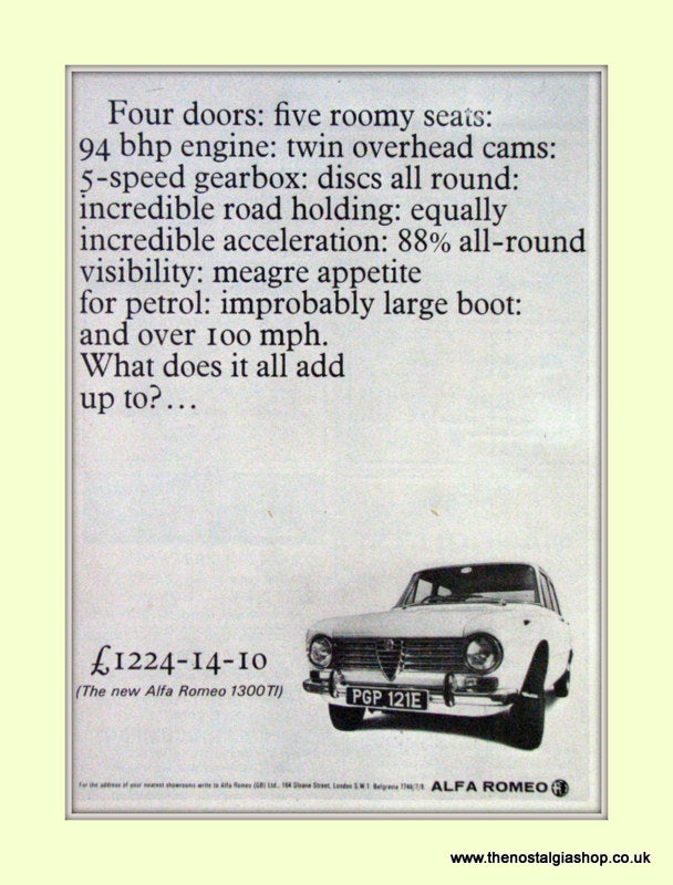 Alfa Romeo 1300 Ti. Original advert 1967. Presented in cream bevel cut mount with backing card and clear bag. Ready to fit in 14 x 11 inch frame. Want it framing? If so, buy this then go to Frames Available Category. Click to buy on the suitable frame(s) and we will do the rest. All our adverts, unless clearly stated are Originals from the date shown They make excellent pieces of wall art and stunning gifts. Many are rare and hard to find and once sold, may not be replaced. Remember you are buying a piece of history. Website watermark is not on original.
