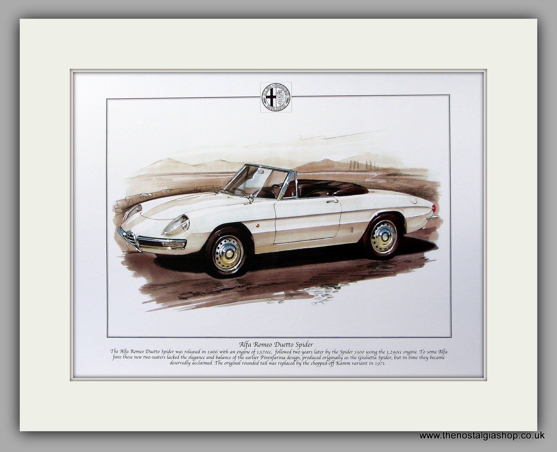 Alfa Romeo Duetto Spider. Beautifully Illustrated print with detailed description of the vehicle. Presented in cream bevel cut mount with backing board and clear wrapping. The perfect gift. Size of the mount is 14 x 11 inches, it is ready to drop straight in to a frame. Framing option available on this print, Add this print to your shopping basket, then go to 'Frames Available" category, Click to buy the suitable frame. We will frame and post your choice. Free UK postage on orders over £20.00. Website watermarks are not present on the prints. Alfa Prints, Alfa Art.