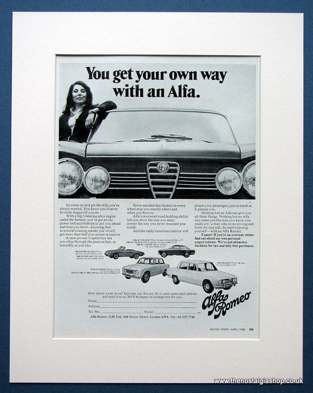 Alfa Romeo Range 1968. You get your own way with an Alfa. Classic original advert 1968. Professionally sealed and presented in cream bevel cut mount with backing card. Ready to fit in 14 x 11 inch frame. Want it framing? If so, buy this then go to Frames Available Catagory. Click to buy on the suitable frame and we will do the rest. All our adverts, unless clearly stated are Originals from the date shown They make excellent pieces of wall art and stunning gifts. Many are rare and hard to find and once sold, may not be replaced. Remember you are buying a piece of history. Website watermark is not on original.