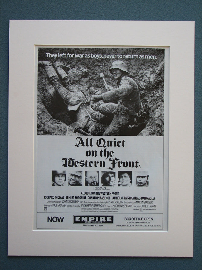 All Quiet On The Western Front. Richard Thomas, Ernest Borgnine, Donald Pleasence. Classic original advert 1980. Presented in cream bevel cut mount with backing card. Ready to fit in 14 x 11 inch frame. Want it framing? buy this then go to Frames Available Category. Click to buy on the suitable frame and we will do the rest. All our adverts, unless clearly stated are Originals from the date shown They make excellent pieces of wall art and stunning gifts. Many are rare and hard to find and once sold, may not be replaced. Remember you are buying a piece of history.
