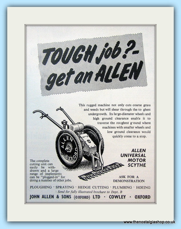Allen Universal Motor Scythe. John Allen & Sons Ltd.Classic original advert 1960. Presented in cream bevel cut mount (10 x 8 inch) with backing card and clear bag. Ready to fit in 10 x 8 inch frame. Want it framing? If so, buy this then go to Frames Available Category. Click to buy on the suitable frame and we will do the rest. All our adverts, unless clearly stated are Originals from the date shown They make excellent pieces of wall art and stunning gifts.Watermarks are not present on the original.