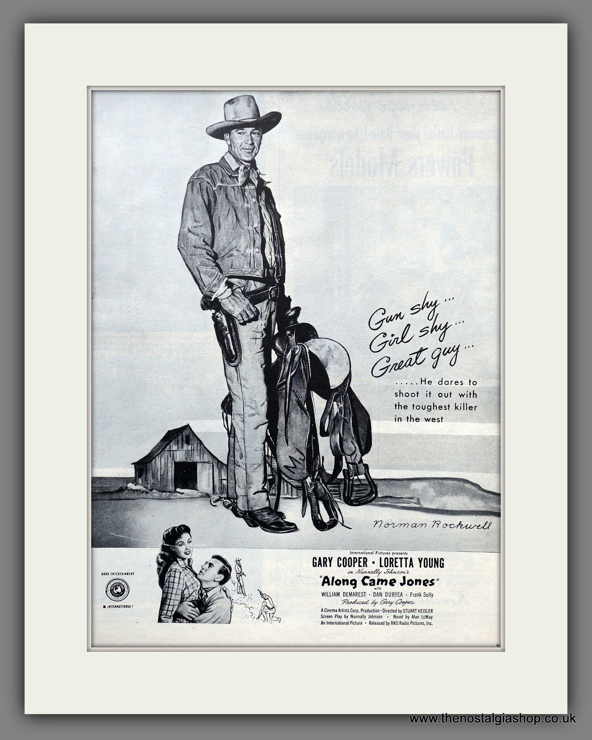 Along Came Jones. Gary Cooper, Loretta Young. Classic Original Advert 1945. Presented in cream bevel cut mount with backing card. Ready to fit in 18 x 14 inch frame. All our adverts, unless clearly stated are Originals from the date shown They make excellent pieces of wall art and stunning gifts. Many are rare and hard to find and once sold, may not be replaced. Remember you are buying a piece of history. Website watermark is not on original. NOTE small repair bottom left of advert.