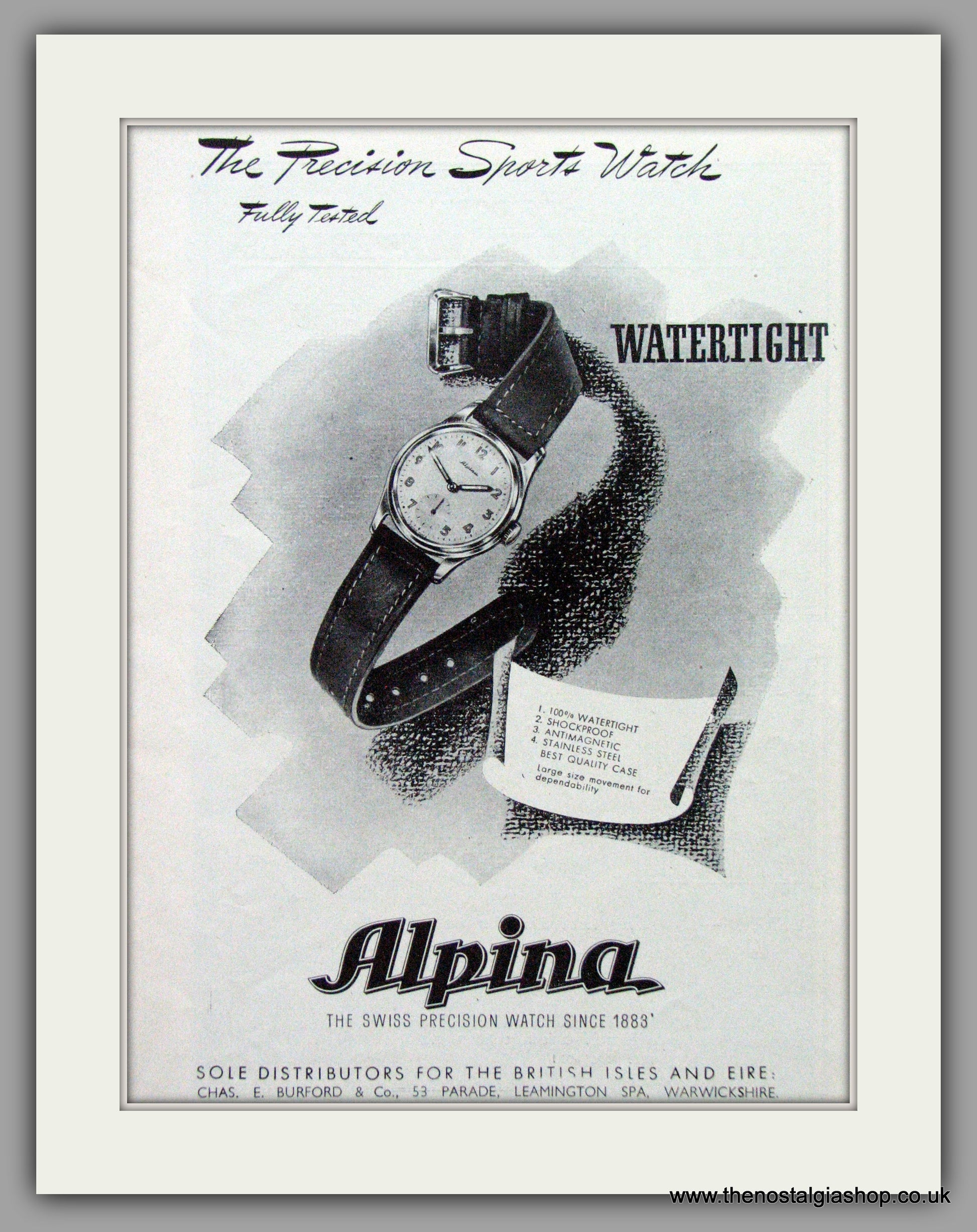 Alpina Watches. Watertight. Vintage Advert. Original Advert 1948. Presented in cream bevel cut mount with backing card and clear bag. Ready to fit in 14 x 11 inch frame. Want it framing? If so, buy this then go to Frames Available Category. Click to buy on the suitable frame(s) and we will do the rest. All our adverts, unless clearly stated are Originals from the date shown. They make excellent pieces of wall art and stunning gifts. Many are rare and hard to find and once sold, may not be replaced. Remember you are buying a piece of history. Website watermark is not on original.