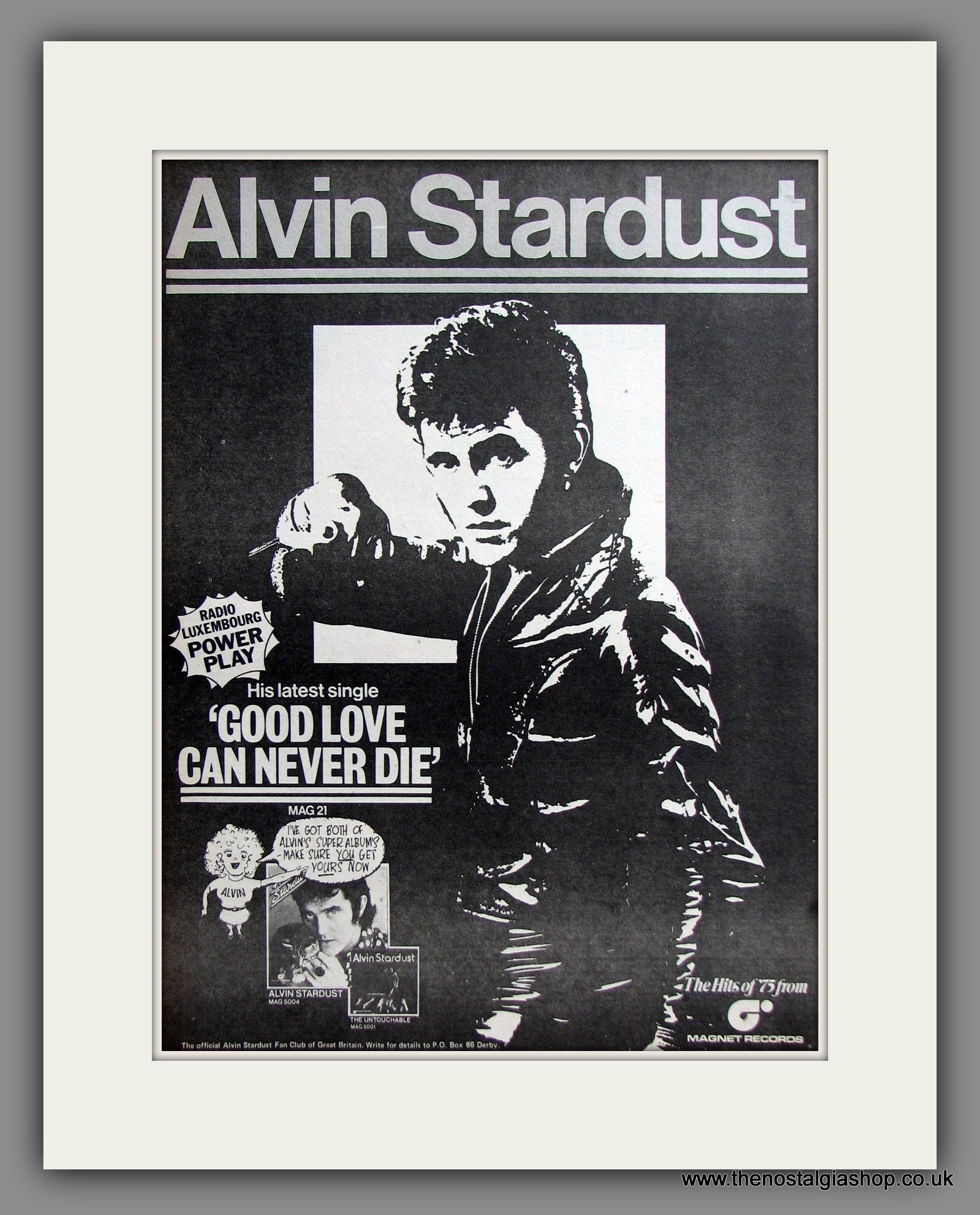 Alvin Stardust. Good Love Can Never Die. Original Advert 1975 (ref AD11481). Presented and supplied in a cream bevel cut mount with backing card and clear bag. Ready to fit in a 20x16 inch frame. The mounted advert will be posted via courier and well packed - protected with a sheet of hardboard to keep it rigid. Any questions or enquiries, please get in touch, we are here to help! All our adverts, unless clearly stated are originals from the date shown. They make excellent pieces of wall art and stunning gifts. Many are rare and hard to find and once sold, may not be replaced. Remember you are buying a piece of history. Website watermark is not on original.