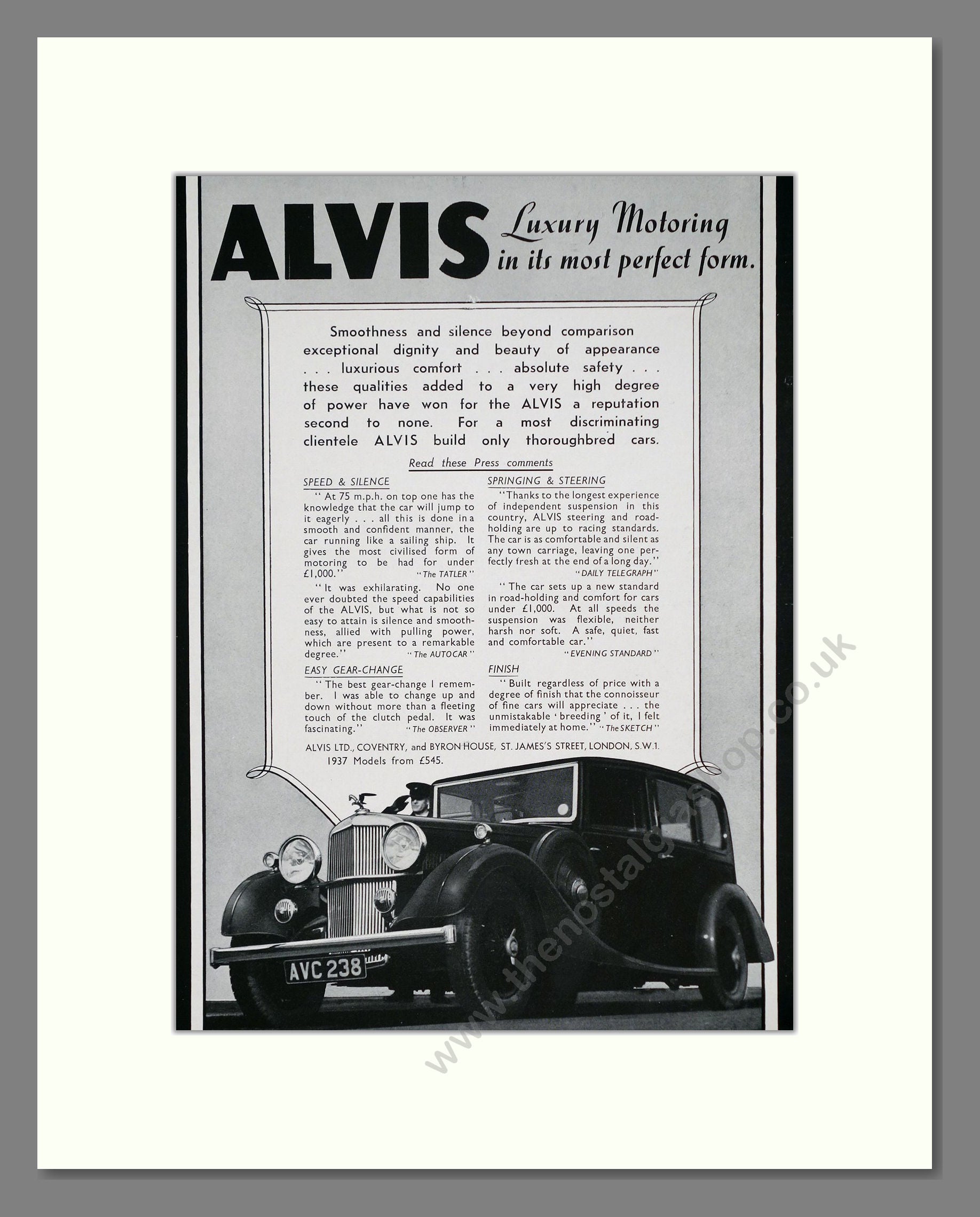 Alvis. Original Vintage Advert 1937. Presented and Supplied in a cream bevel cut mount with backing card and clear bag. Ready to fit in 18 x 14 inch frame. All our adverts, unless clearly stated are Originals from the date shown They make excellent pieces of wall art and stunning gifts. Many are rare and hard to find and once sold, may not be replaced. Remember you are buying a piece of history. Website watermark is not on original.