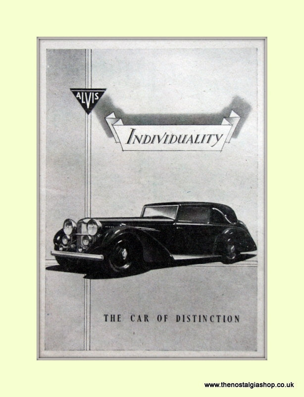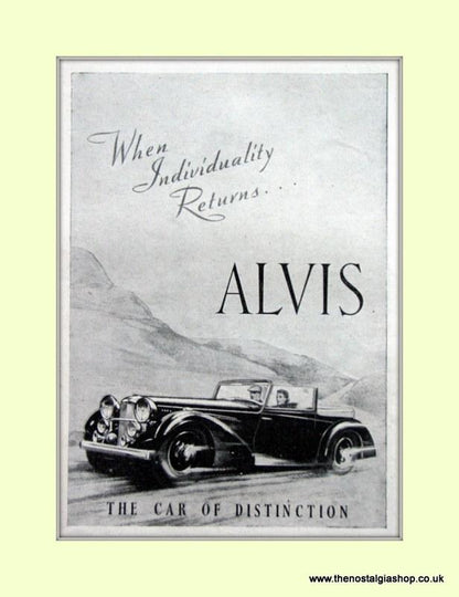 Alvis. When individuality returns...Set of 2 Classic original adverts 1944.Each is presented in cream bevel cut mount with backing card and clear bag. Each is ready to fit in 14 x 11 inch frames. Want them framing? If so, buy this then go to Frames Available Category. Click to buy on the suitable frames and we will do the rest. All our adverts, unless clearly stated are Originals from the date shown, and NOT modern reproductions. They make excellent pieces of wall art and stunning gifts. Many are rare and hard to find and once sold, may not be replaced. Remember you are buying a piece of history. Website watermark is not on original.