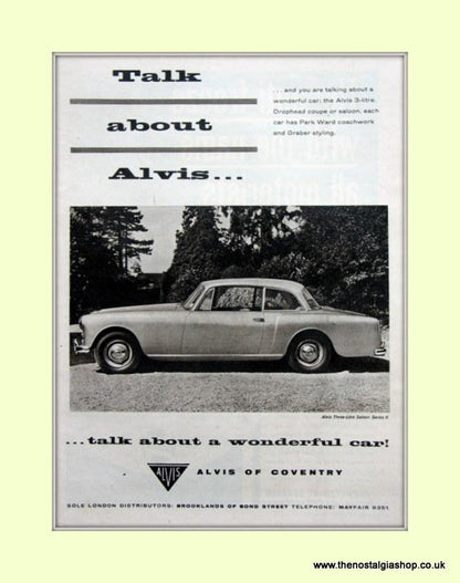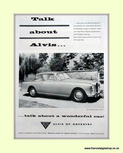 Alvis Three Litre and Coupe . Talk about Alvis.Set of 3 Classic original adverts 1958 and 1962.Presented in cream bevel cut mounts with backing card and clear bag. Ready to fit in 14 x 11 inch frames. Want them framing? If so, buy this then go to Frames Available Category. Click to buy on the suitable frames and we will do the rest. All our adverts, unless clearly stated are Originals from the date shown, and NOT modern reproductions. They make excellent pieces of wall art and stunning gifts. Many are rare and hard to find and once sold, may not be replaced. Remember you are buying a piece of history. Website watermark is not on original.