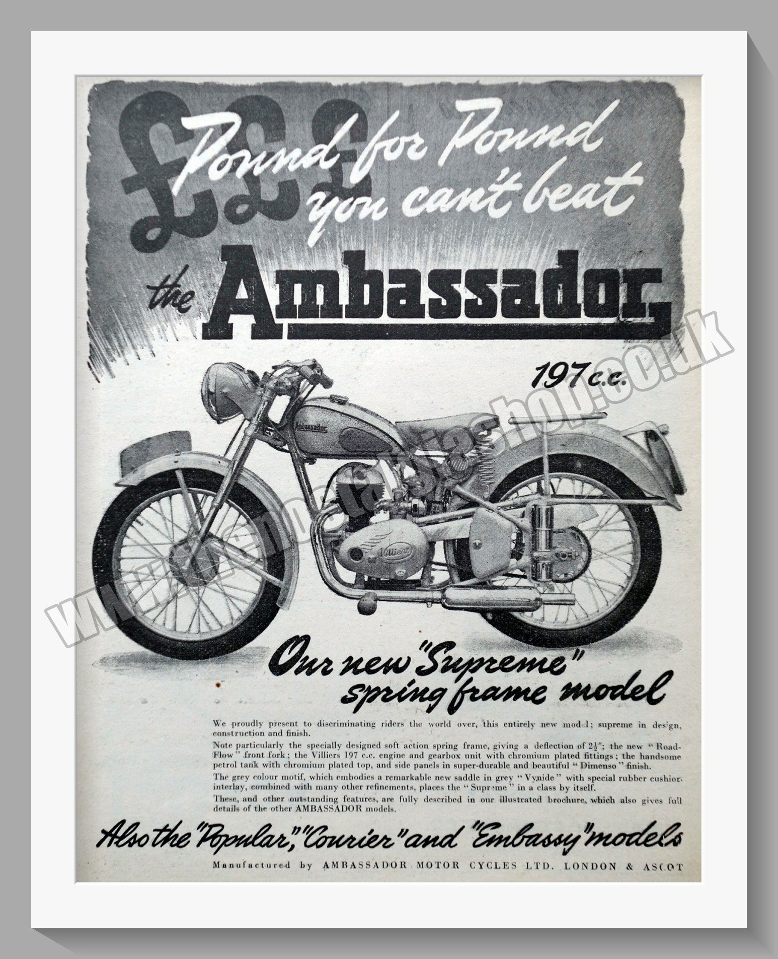 Ambassador Supreme Motor Cycle. Original Vintage Advert 1950. Presented and Supplied in a 14 x 11 Inch, cream bevel cut mount with backing card and clear bag. Ready to frame. All our adverts, unless clearly stated are Originals from the date shown They make excellent pieces of wall art and stunning gifts. Many are rare and hard to find and once sold, may not be replaced. Remember you are buying a piece of history. Website watermark is not on original. Ambassador Motor Cycle Ltd.