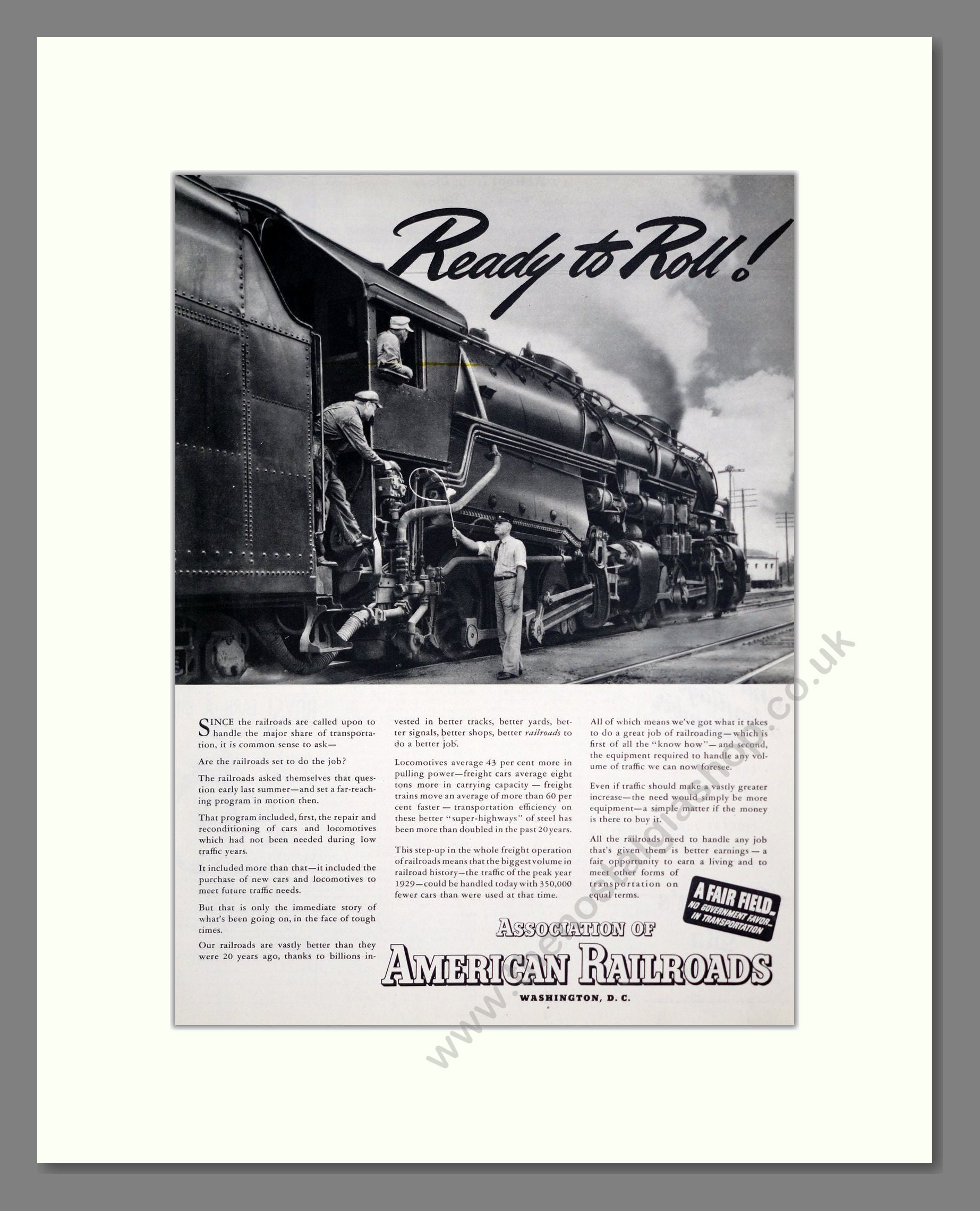 American Railroads - Ready To Roll. Vintage Advert. This is a large classic original advert from 1939. Presented and supplied in a cream bevel cut mount with backing card and clear bag. Ready to fit in a 18 x 14 inches frame. The mounted advert will be posted via courier and well packed - protected with a sheet of hardboard to keep it rigid. Any questions or enquiries, please get in touch, we are here to help! All our adverts, unless clearly stated are originals from the date shown. They make excellent pieces of wall art and stunning gifts. Many are rare and hard to find and once sold, may not be replaced. Remember you are buying a piece of history. Website watermark is not on original.
