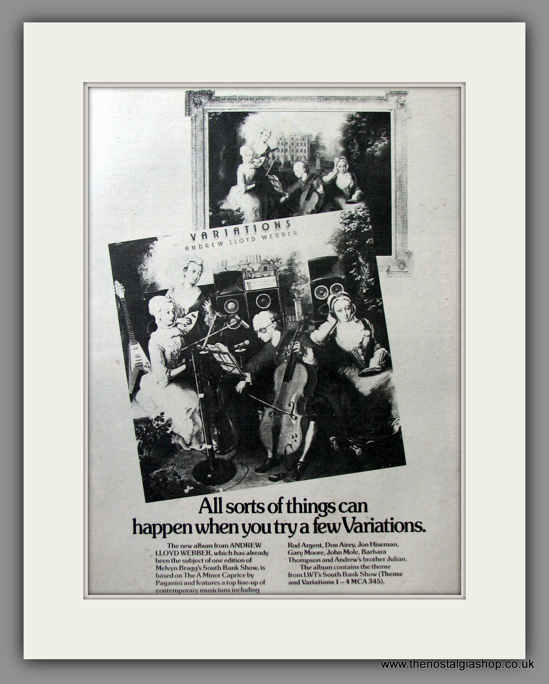 Andrew Lloyd-Webber. Variations. Original Advert 1978 (ref AD11517). Presented and supplied in a cream bevel cut mount with backing card and clear bag. Ready to fit in a 20x16 inch frame. The mounted advert will be posted via courier and well packed - protected with a sheet of hardboard to keep it rigid. Any questions or enquiries, please get in touch, we are here to help! All our adverts, unless clearly stated are originals from the date shown. They make excellent pieces of wall art and stunning gifts. Many are rare and hard to find and once sold, may not be replaced. Remember you are buying a piece of history. Website watermark is not on original.