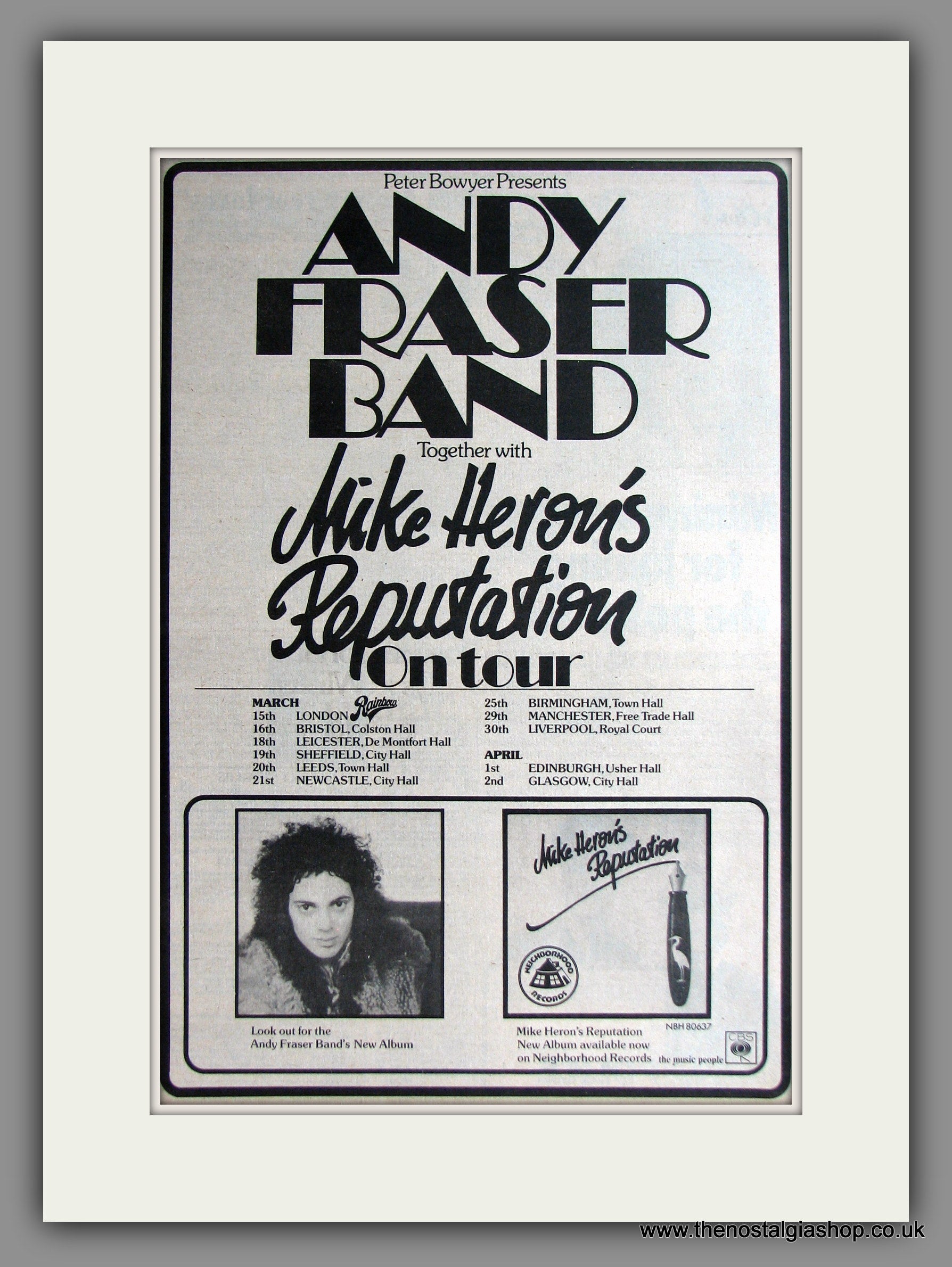 Andy Fraser Band. UK tour. Original Advert 1975 (ref AD11498). Presented and supplied in a cream bevel cut mount with backing card and clear bag. Ready to fit in a 20x16 inch frame. The mounted advert will be posted via courier and well packed - protected with a sheet of hardboard to keep it rigid. Any questions or enquiries, please get in touch, we are here to help! All our adverts, unless clearly stated are originals from the date shown. They make excellent pieces of wall art and stunning gifts. Many are rare and hard to find and once sold, may not be replaced. Remember you are buying a piece of history. Website watermark is not on original.