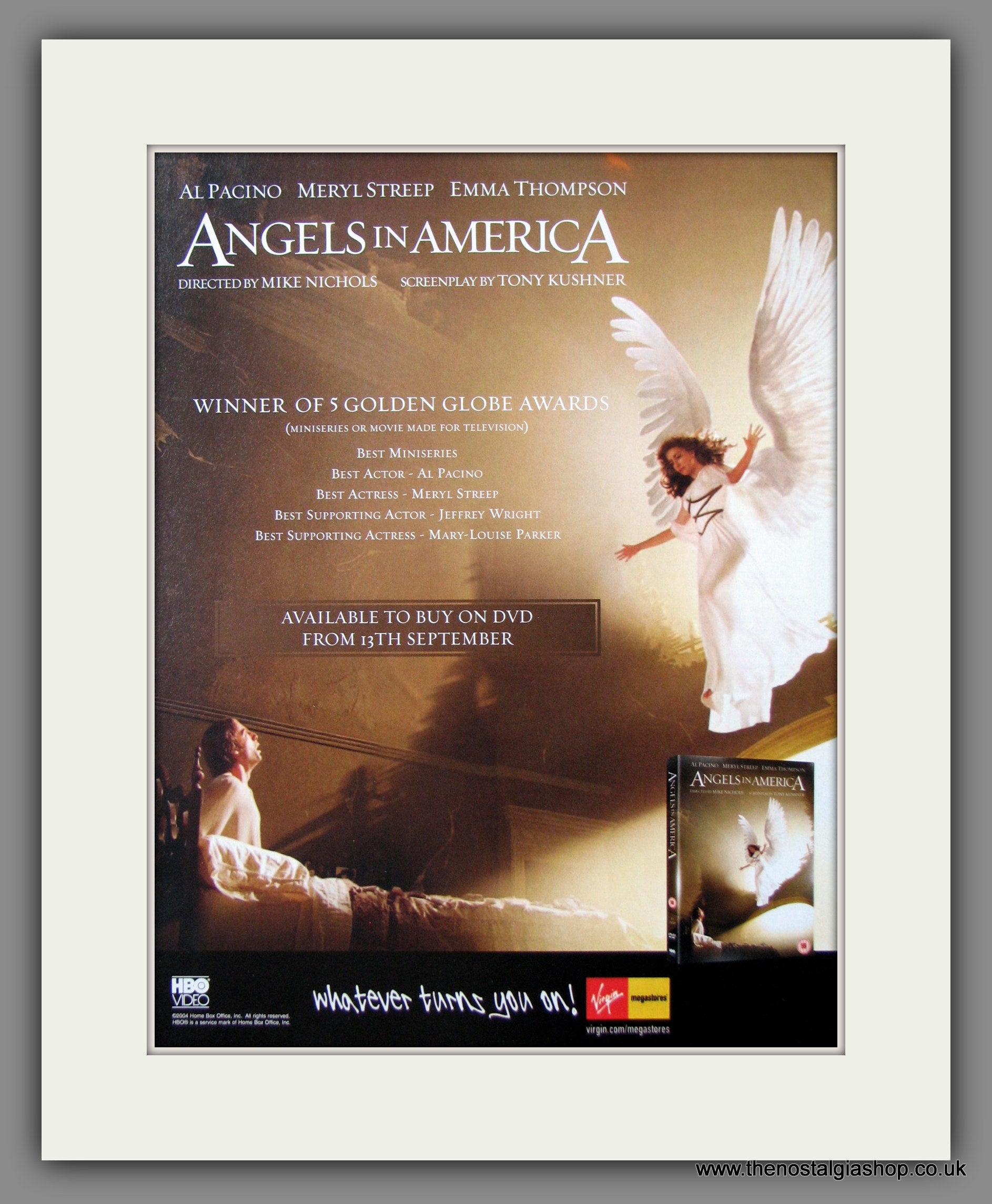 Angels In America, Al Pacino, Meryl Streep, Emma Thompson. 2004 Classic Original advert. Presented and Supplied in a cream bevel cut mount with backing card and clear bag. Ready to fit in 14 x 11 inch frame. Want it framing? If so, buy this then go to Frames Available Category. Click to buy on the suitable frame and we will do the rest. All our adverts, unless clearly stated are Originals from the date shown. They make excellent pieces of wall art and stunning gifts. Many are rare and hard to find and once sold, may not be replaced. Remember you are buying a piece of history. Website watermark is not on original.