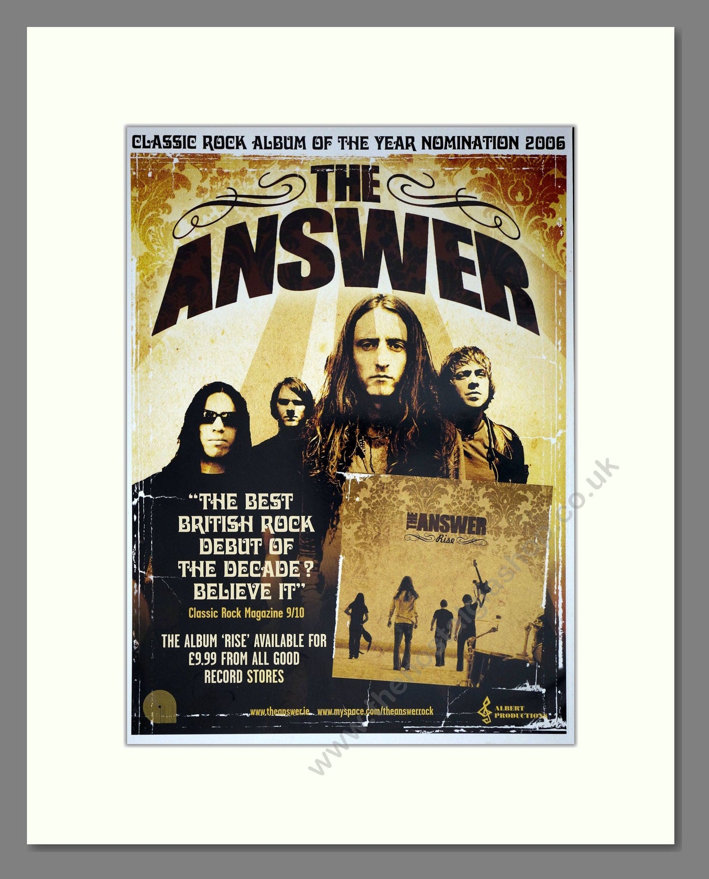 Answer (The) - Rise. Vintage Advert. This is a classic original advert from 2006. Presented and supplied in a cream bevel cut mount with backing card and clear bag. Ready to fit in a 14 x 11 inches frame. The mounted advert will be posted via courier and well packed - protected with a sheet of hardboard to keep it rigid. Any questions or enquiries, please get in touch, we are here to help! All our adverts, unless clearly stated are originals from the date shown. They make excellent pieces of wall art and stunning gifts. Many are rare and hard to find and once sold, may not be replaced. Remember you are buying a piece of history. Website watermark is not on original.