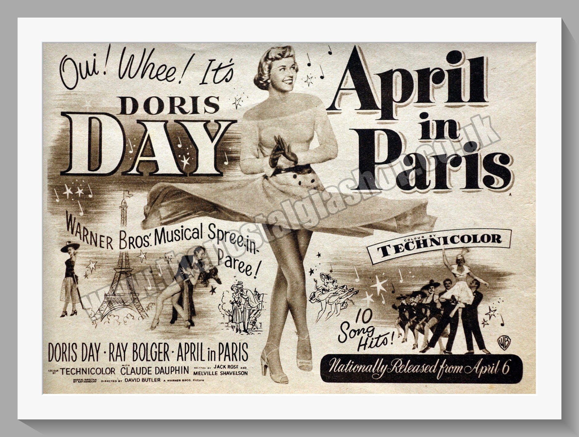 April In Paris. Doris Day. Original Vintage Advert 1953. Presented and Supplied in a 12 x 10 Inch, cream bevel cut mount with backing card and clear bag. Ready to frame. All our adverts, unless clearly stated are Originals from the date shown. They make excellent pieces of wall art and stunning gifts. Many are rare and hard to find and once sold, may not be replaced. Remember you are buying a piece of history. Website watermark is not on original.