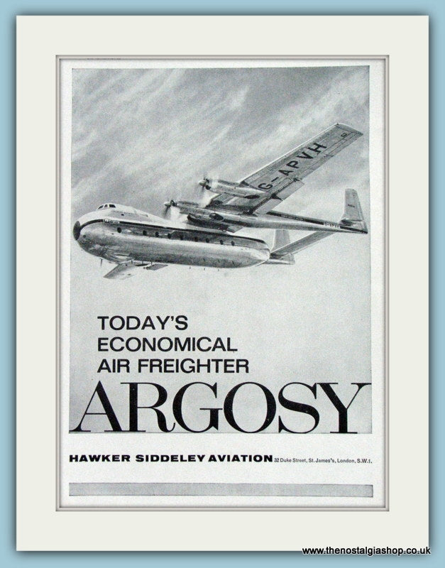 Argosy. Today's economical air freighter. Classic original advert 1961. Presented in cream bevel cut mount with backing card and clear bag. Ready to fit in 14 x 11 inch frame. Want it framing? If so, buy this then go to Frames Available Category. Click to buy on the suitable frame and we will do the rest. All our adverts, unless clearly stated are Originals from the date shown. They make excellent pieces of wall art and stunning gifts. Many are rare and hard to find and once sold, may not be replaced. Remember you are buying a piece of history. Website watermark is not on original.