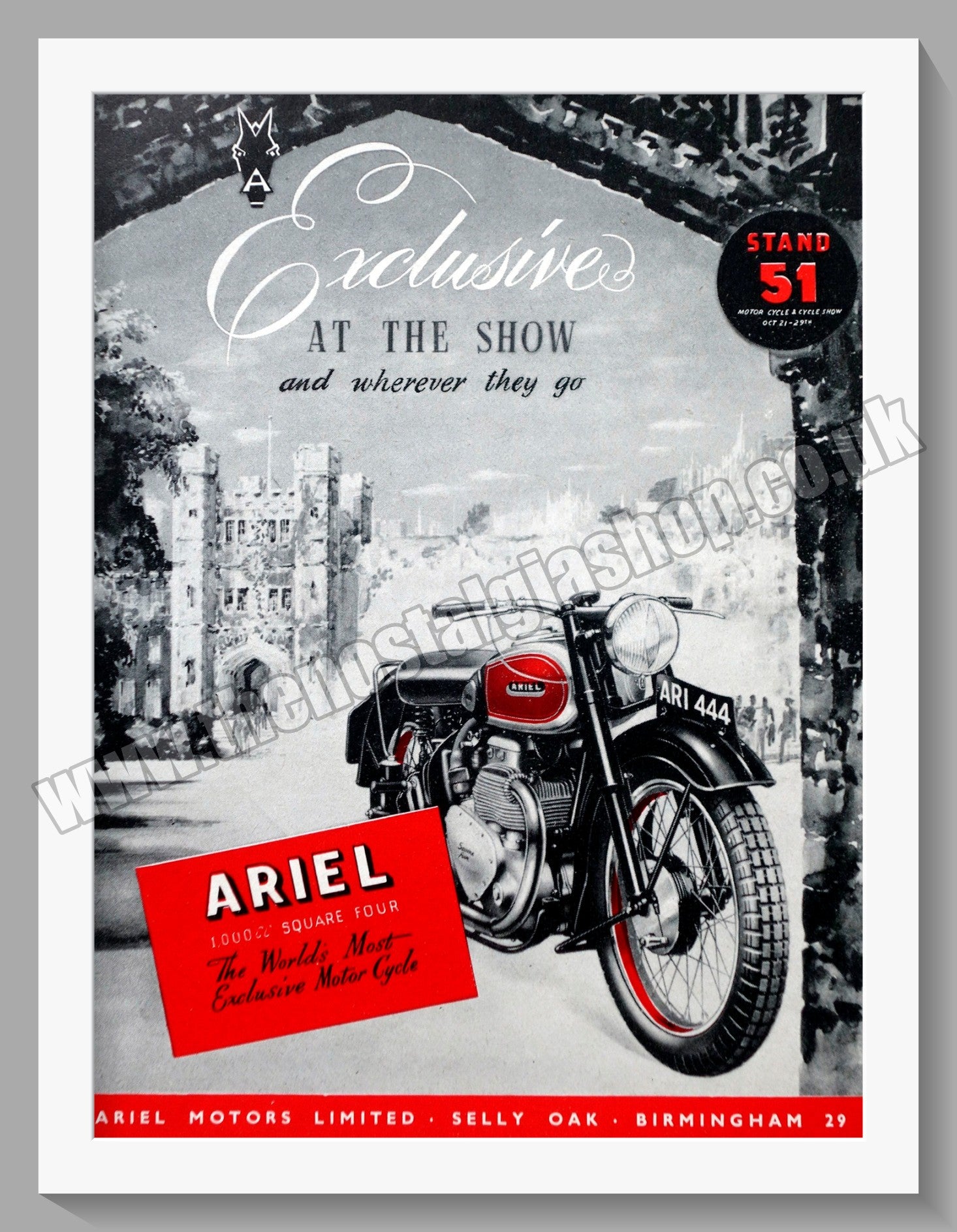 Ariel 1000cc Square 4 Motorcycles. Original Vintage Advert 1949. Presented and Supplied in a cream bevel cut mount with backing card and clear bag. Ready to fit in 14 x 11 inch frame. All our adverts, unless clearly stated are Originals from the date shown They make excellent pieces of wall art and stunning gifts. Many are rare and hard to find and once sold, may not be replaced. Remember you are buying a piece of history. Website watermark is not on original. Ariel Motors Ltd, Ariel Bikes, Vintage Ariels. Ariel Motorcycles.
