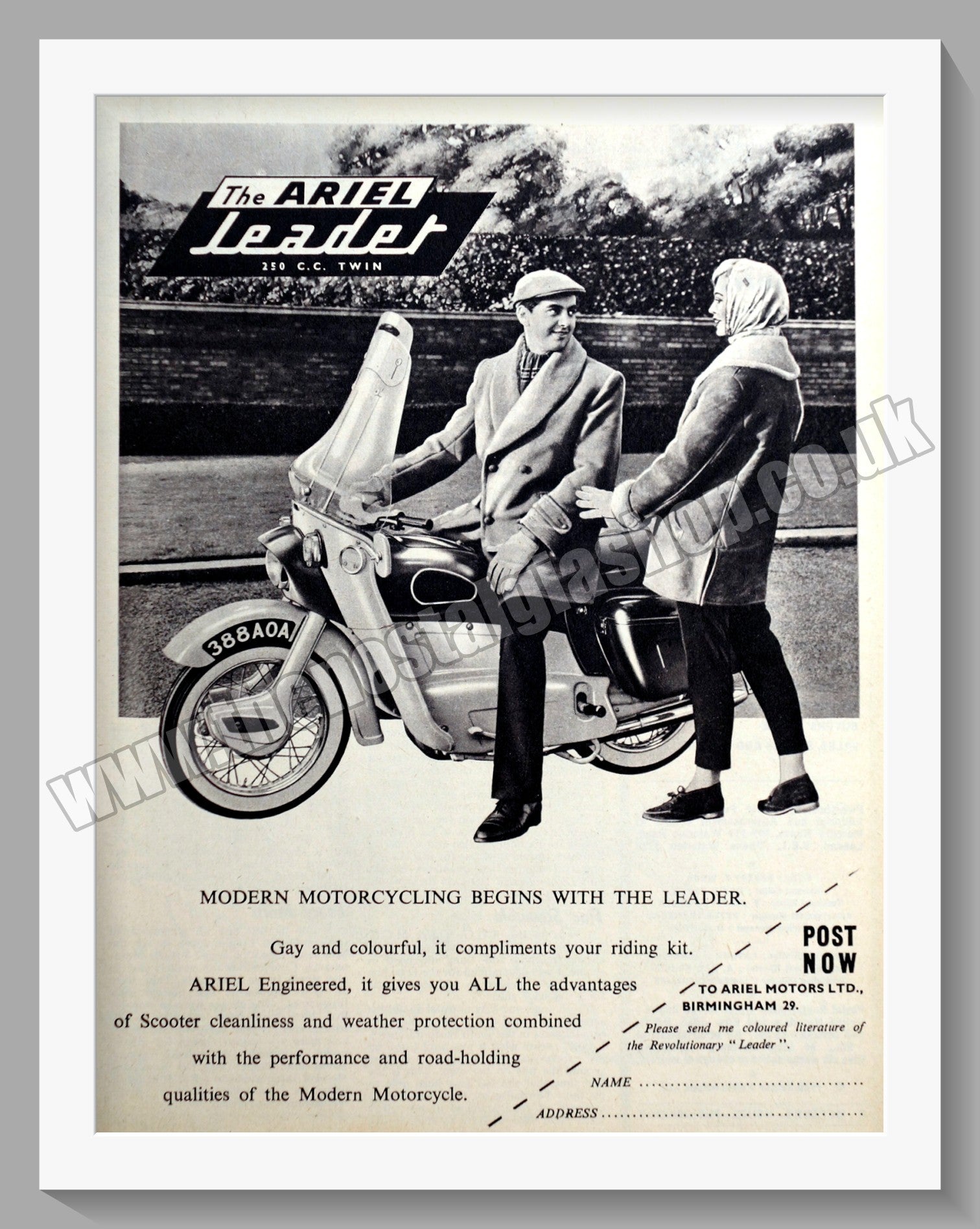 Ariel 250cc Twin Leader Motorcycles. Original Vintage Adverts 1960. Presented and Supplied in a cream bevel cut mount with backing card and clear bag. Ready to fit in 14 x 11 inch frame. All our adverts, unless clearly stated are Originals from the date shown They make excellent pieces of wall art and stunning gifts. Many are rare and hard to find and once sold, may not be replaced. Remember you are buying a piece of history. Website watermark is not on original. Ariel Motors Ltd, Ariel Bikes, Vintage Ariels. Ariel Motorcycles.