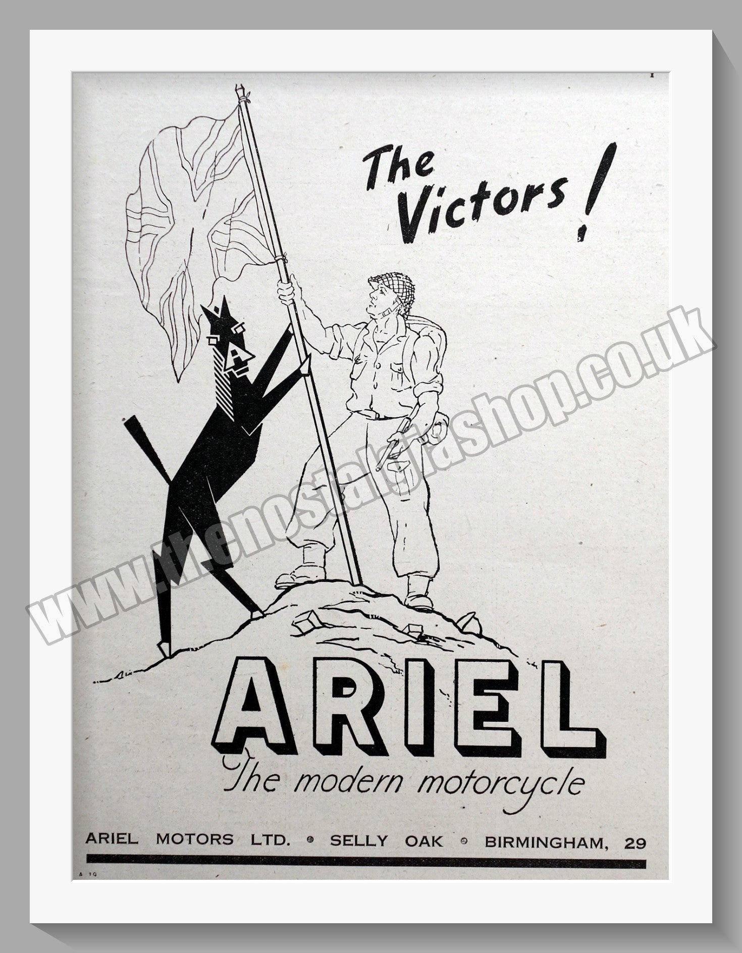 Ariel Motorcycles. Original Vintage Adverts 1945. Presented and Supplied in a cream bevel cut mount with backing card and clear bag. Ready to fit in 14 x 11 inch frame. All our adverts, unless clearly stated are Originals from the date shown They make excellent pieces of wall art and stunning gifts. Many are rare and hard to find and once sold, may not be replaced. Remember you are buying a piece of history. Website watermark is not on original. Ariel Motors Ltd, Ariel Bikes, Vintage Ariels. Ariel Motorcycles.