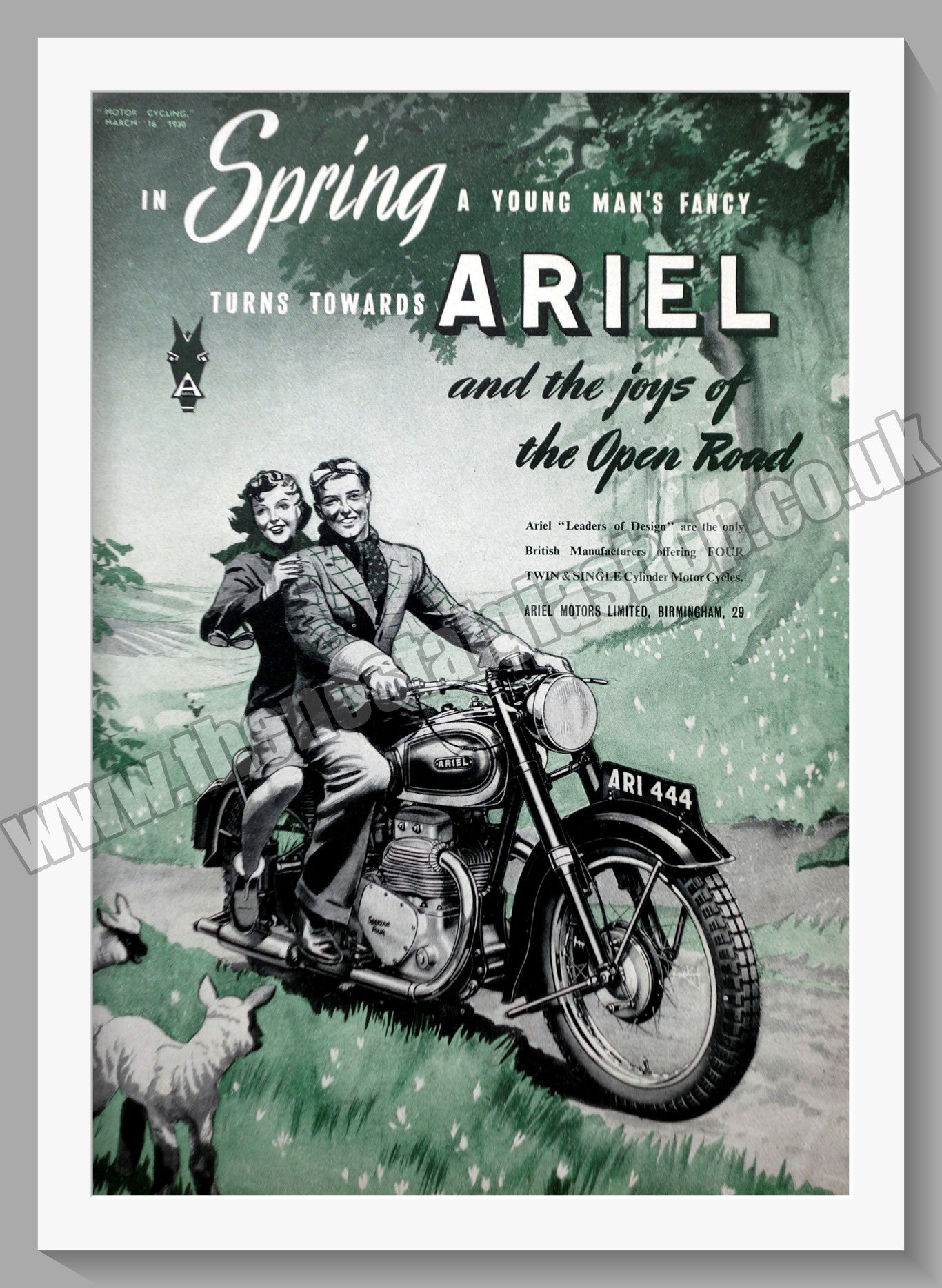 Ariel Motorcycles. Original Vintage Advert 1950. Presented and Supplied in a cream bevel cut mount with backing card and clear bag. Ready to fit in 14 x 11 inch frame. All our adverts, unless clearly stated are Originals from the date shown They make excellent pieces of wall art and stunning gifts. Many are rare and hard to find and once sold, may not be replaced. Remember you are buying a piece of history. Website watermark is not on original. Ariel Motors Ltd, Ariel Bikes, Vintage Ariels. Ariel Motorcycles.