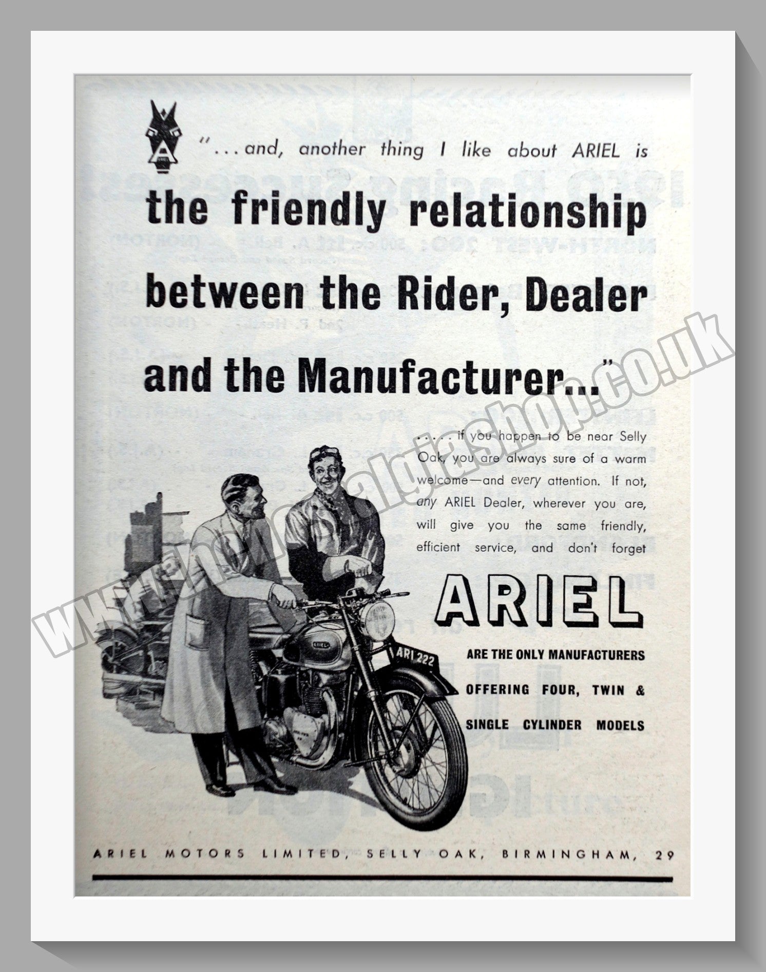 Ariel Motorcycles. Original Vintage Adverts 1950. Presented and Supplied in a cream bevel cut mount with backing card and clear bag. Ready to fit in 14 x 11 inch frame. All our adverts, unless clearly stated are Originals from the date shown They make excellent pieces of wall art and stunning gifts. Many are rare and hard to find and once sold, may not be replaced. Remember you are buying a piece of history. Website watermark is not on original. Ariel Motors Ltd, Ariel Bikes, Vintage Ariels. Ariel Motorcycles.