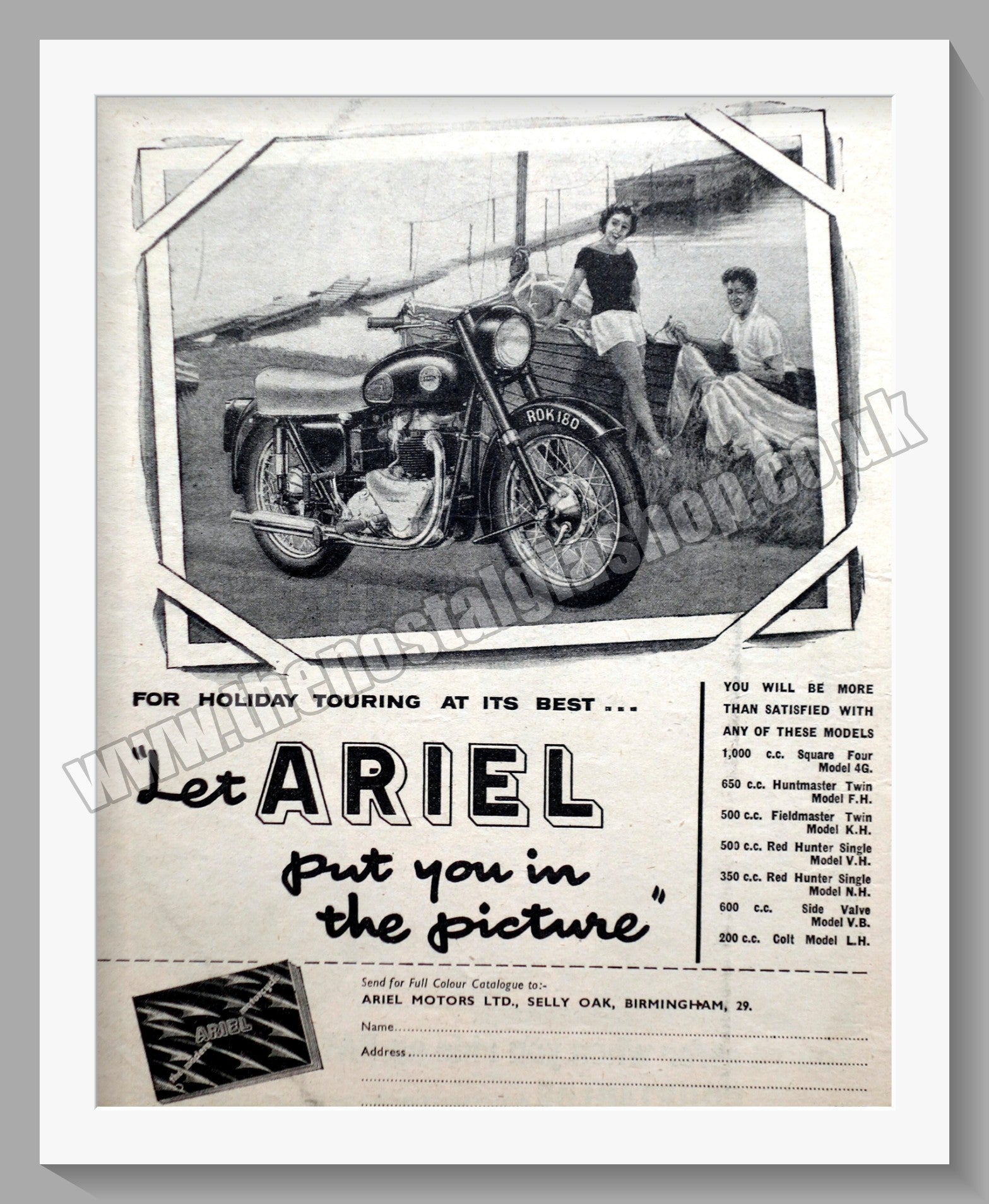 Ariel Motorcycles. Original Vintage Adverts 1957. Presented and Supplied in a cream bevel cut mount with backing card and clear bag. Ready to fit in 14 x 11 inch frame. All our adverts, unless clearly stated are Originals from the date shown They make excellent pieces of wall art and stunning gifts. Many are rare and hard to find and once sold, may not be replaced. Remember you are buying a piece of history. Website watermark is not on original. Ariel Motors Ltd, Ariel Bikes, Vintage Ariels. Ariel Motorcycles.