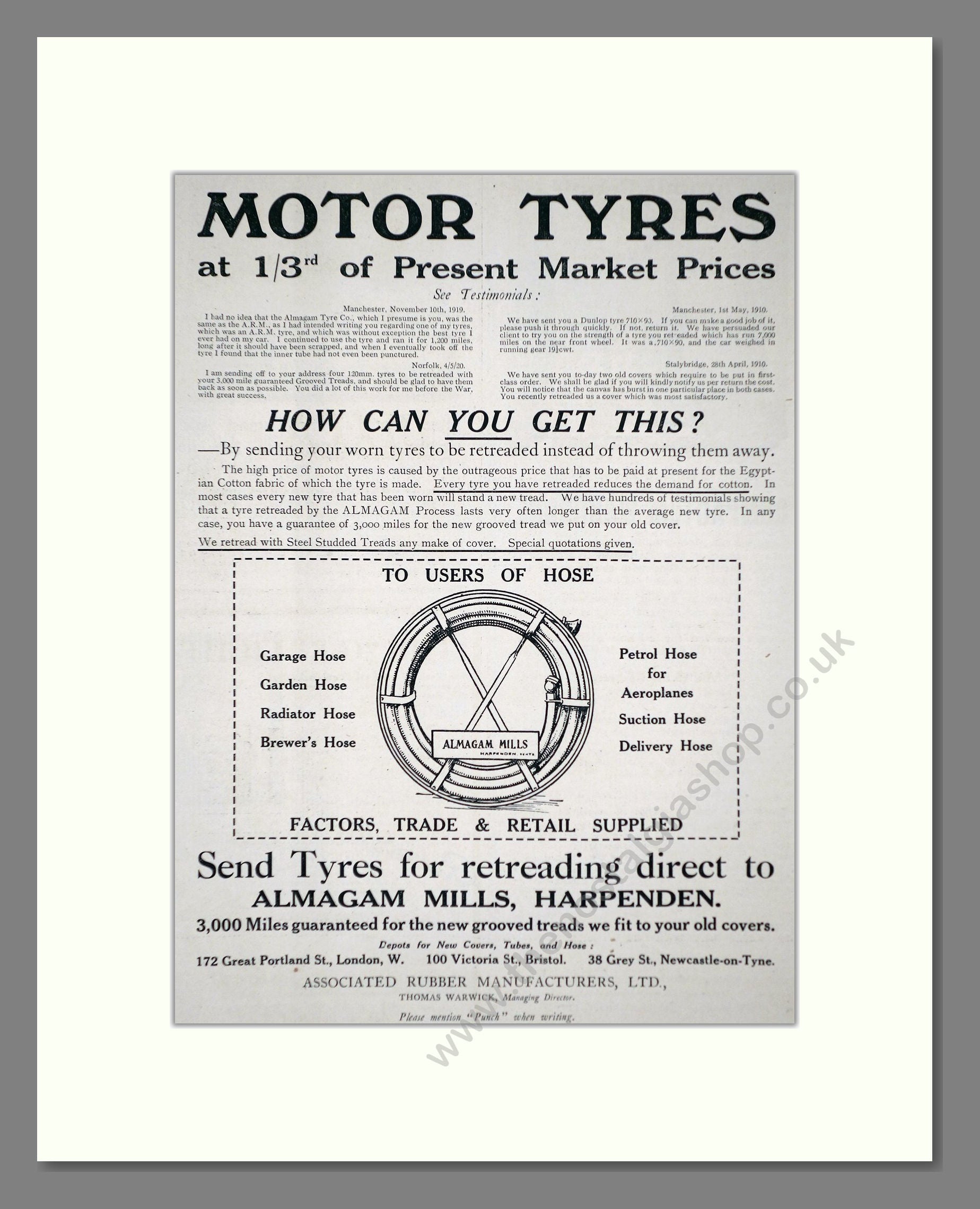Associated Rubber Manufacturers - Retread Tyres. Vintage Advert. This is a classic original advert from 1920. Presented and supplied in a cream bevel cut mount with backing card and clear bag. Ready to fit in a 14 x 11 inches frame. The mounted advert will be posted via courier and well packed - protected with a sheet of hardboard to keep it rigid. Any questions or enquiries, please get in touch, we are here to help! All our adverts, unless clearly stated are originals from the date shown. They make excellent pieces of wall art and stunning gifts. Many are rare and hard to find and once sold, may not be replaced. Remember you are buying a piece of history. Website watermark is not on original. Vintage Tyres, Vintage Wheels