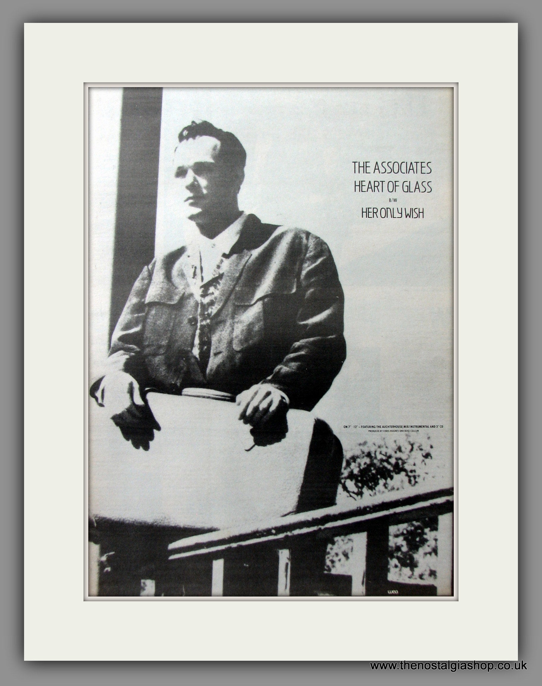 The Associates, Heart Of Glass. This is a large classic Original Vintage Advert 1988. Presented and Supplied in a cream bevel cut mount with backing card and clear bag. Ready to fit in 20 x 16 inch frame. The mounted advert will be posted via courier and well packed - protected with a sheet of hardboard to keep it rigid. Any questions or inquiries, please get in touch, we are here to help! All our adverts, unless clearly stated are Originals from the date shown. They make excellent pieces of wall art and stunning gifts. Many are rare and hard to find and once sold, may not be replaced. Remember you are buying a piece of history. Website watermark is not on original.
