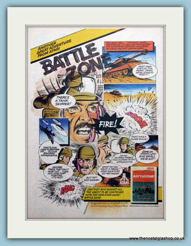 Atari Battle Zone. Another great adventure from Atari. Classic original advert 1984. Presented in cream bevel cut mount with backing card. Ready to fit in 14 x 11 inch frame. Want it framing? If so, buy this then go to Frames Available Catagory. Click to buy on the suitable frame and we will do the rest. All our adverts, unless clearly stated are Originals from the date shown. They make excellent pieces of wall art and stunning gifts. Many are rare and hard to find and once sold, may not be replaced. Remember you are buying a piece of history. Website watermark is not on original.