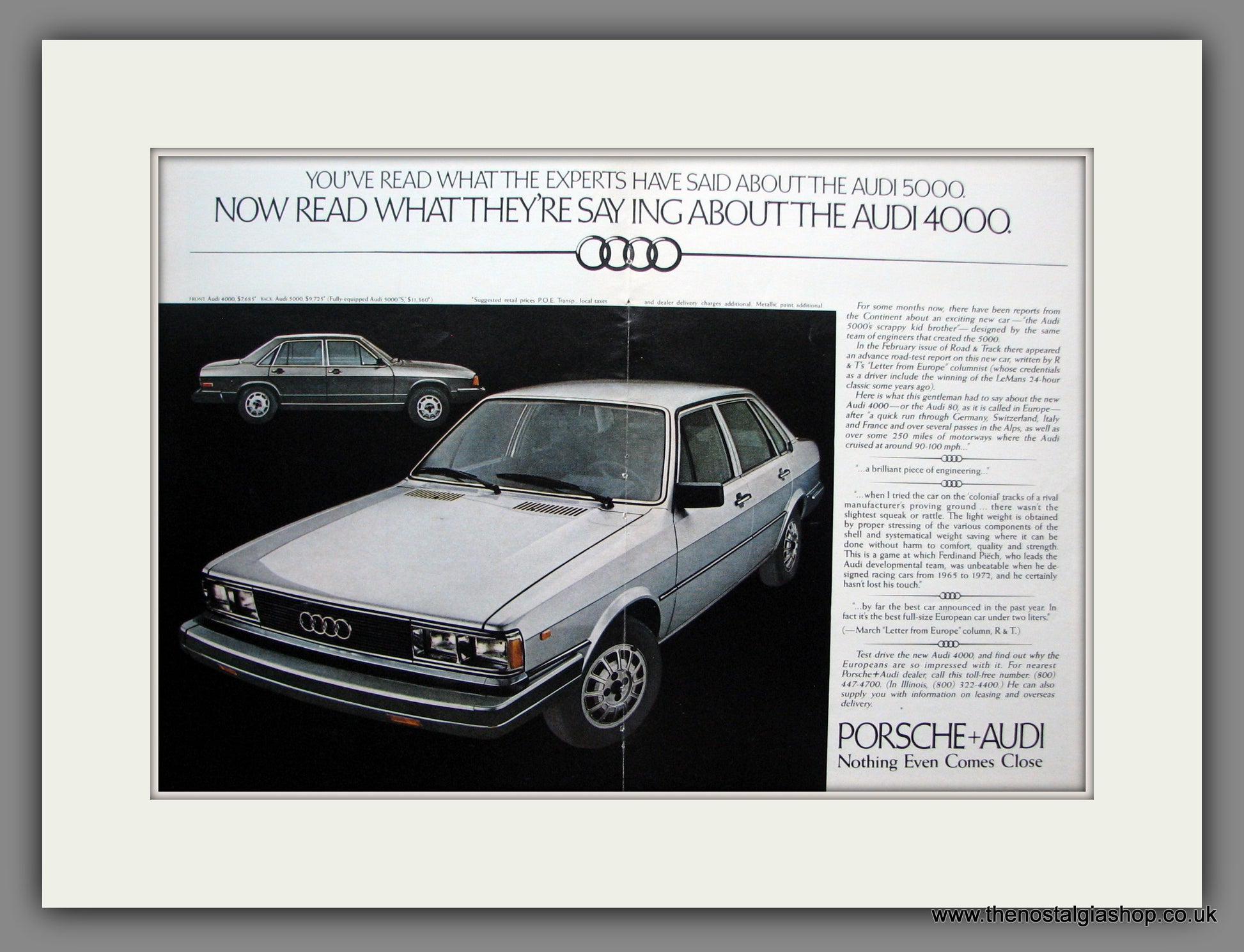 Audi 4000. Original American Advert 1979. Presented and Supplied in a cream bevel cut mount with backing card and clear bag. Ready to fit in 20 x 16 inch frame. All our adverts, unless clearly stated are Originals from the date shown They make excellent pieces of wall art and stunning gifts. Many are rare and hard to find and once sold, may not be replaced. Remember you are buying a piece of history. Website watermark is not on original. Note, Light crease down centre of Advert.