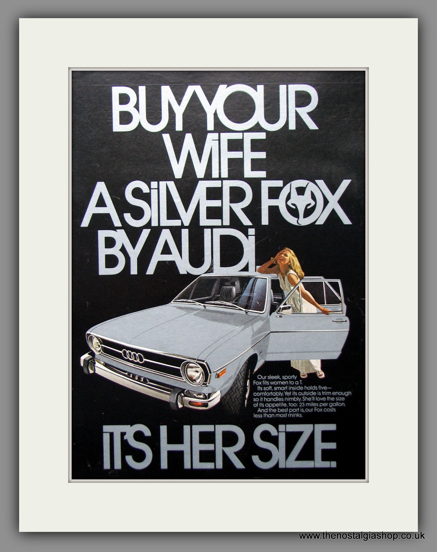Audi Fox. Original American Advert 1973. Presented and Supplied in a cream bevel cut mount with backing card and clear bag. Ready to fit in 14 x 11 inch frame. Want it framing? If so, buy this then go to Frames Available Category. Click to buy on the suitable frame and we will do the rest. All our adverts, unless clearly stated are Originals from the date shown They make excellent pieces of wall art and stunning gifts. Many are rare and hard to find and once sold, may not be replaced. Remember you are buying a piece of history. Website watermark is not on original.