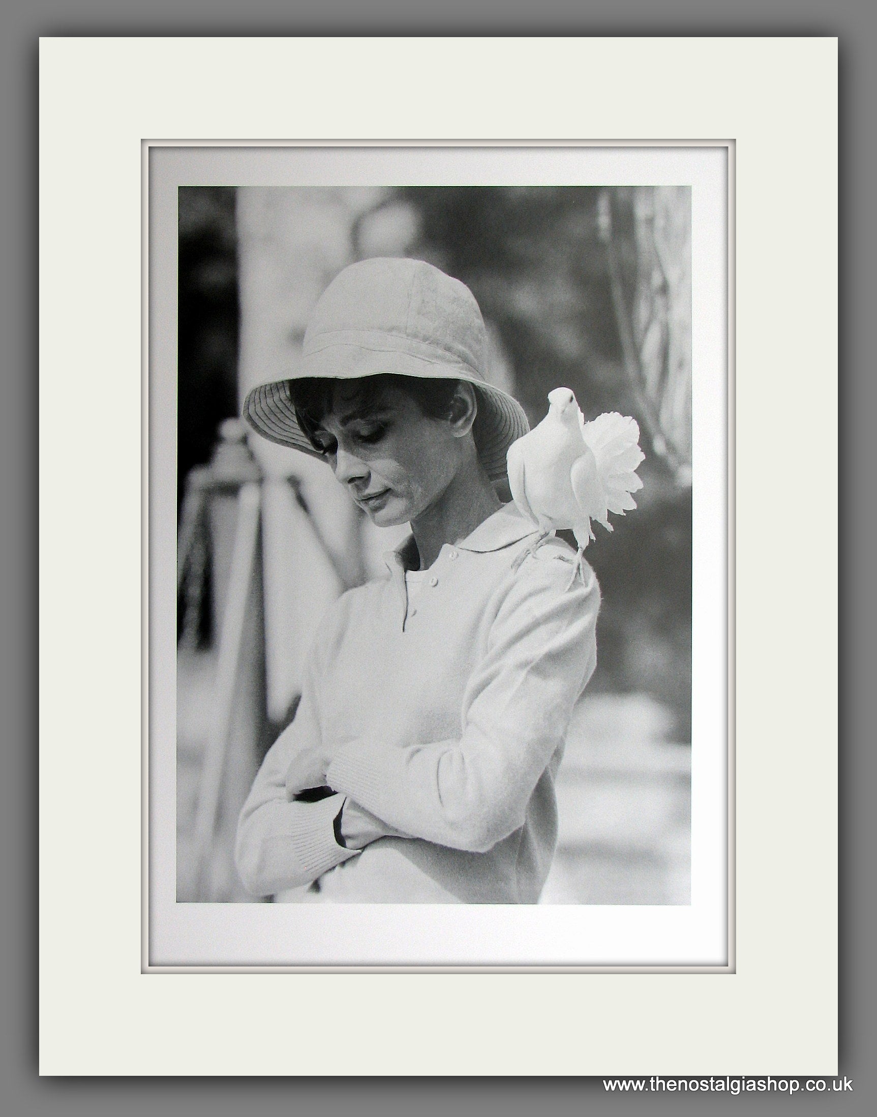 Audrey Hepburn, and White Dove! Quality Print of the Stunning and Beautiful Star. Presented and Supplied in a cream bevel cut mount, Size 18 x 14 Inches, with backing card and clear bag.